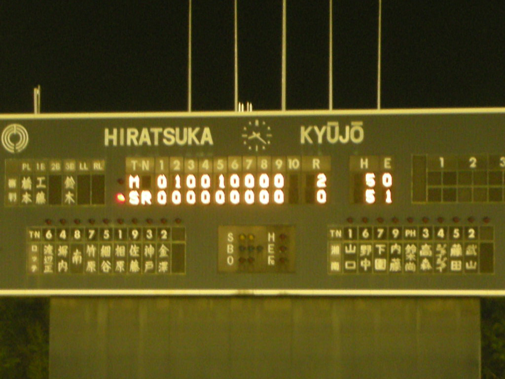 対するロッテの先発は話題の高卒ルーキー唐川君。すでに平塚を訪れているヤクルトの由規君、ハムの中田君と並ぶ今年の「ビッグ3」。まったく手も足も出ず、攻略の糸口すら見出せないまま、唐川君は6回無失点で降板。そのあとを継いだ阿部、相原という若いピッチャーからもいいようにもてあそばれ、最後まで3塁を踏ませてもらえなかった。