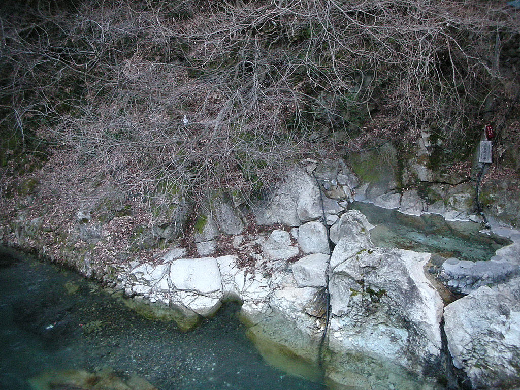 「川辺にあり、強雨や台風などで増水のたびに、戸、羽目の取り外し、取り付け、浴場内の清掃を行っています」。窓の外はすぐ川に面し、床面と湯船には河原の岩がそのまま活かされている。源泉はホースでそのまま湯船に投入しており、高温なので水をちょろちょろと加えている。無色透明のお湯で、小さな湯船からは常にあふれている。この素朴で鄙びた風情は、外の温泉街とは明らかに一線を画している。窓ガラスの落書きだけがちょっと残念。ちなみにこの共同浴場は混浴。女性には勇気が要るかもしれないが、夜通し開いているので、機会があったら訪れてみてほしい。