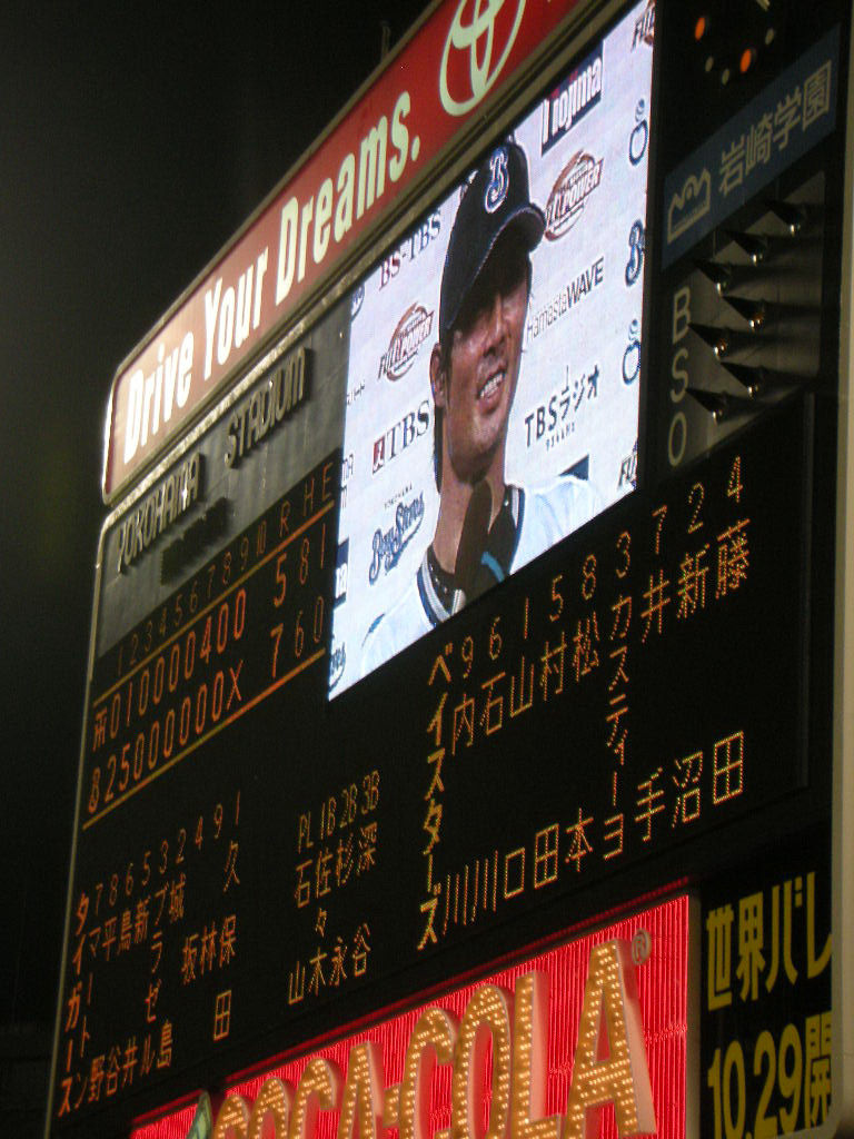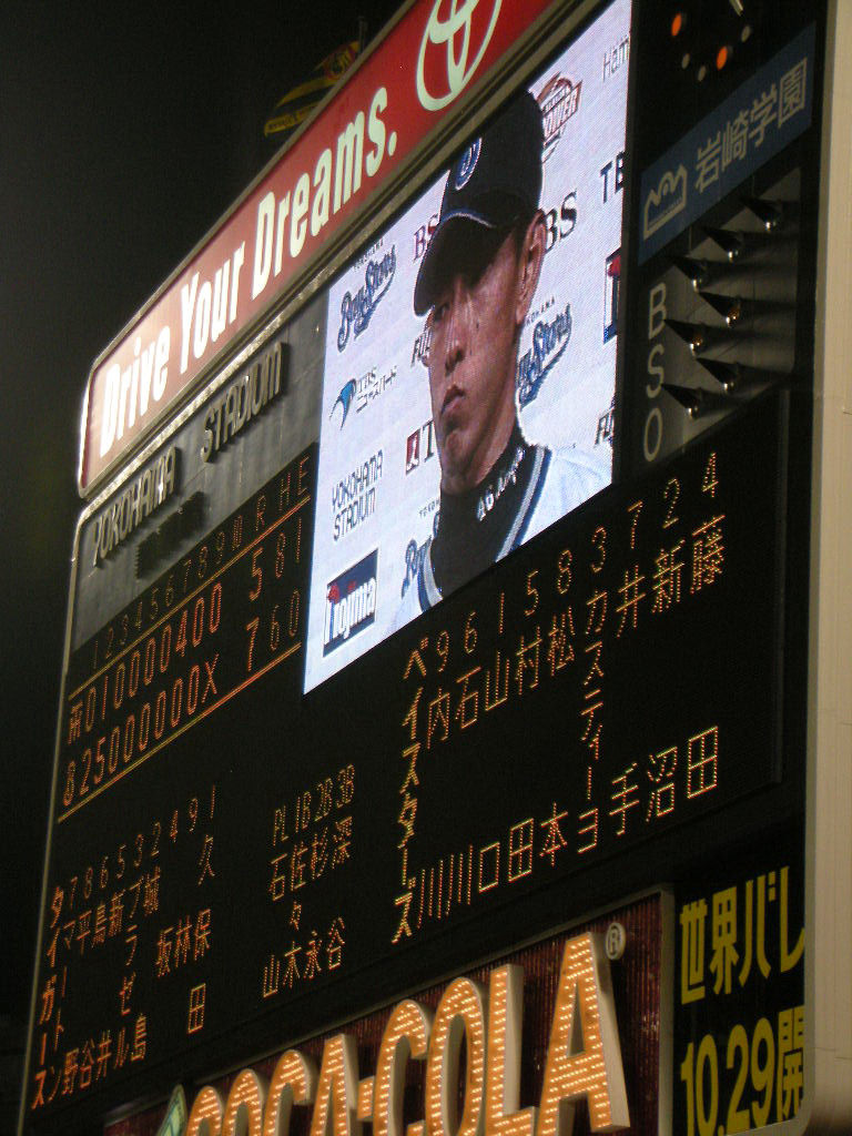 健二朗は立ち上がりに緊張したか、先頭打者のマートンをいきなり歩かせ、送りバントで2塁へ。そしてワイルドピッチで3塁へ。そこでマウンドに歩み寄り声を掛けたのは、石川でも村田でもなく、なんとカスティーヨ。そして、見事ピンチをしのぎ、「アチャいい奴!」と個人的評価も急上昇。下柳も初回にボークでランナーを3塁に進め、さらに村田を歩かせ、スレッジには2点タイムリー。2回には満塁から「わっしょい!わっしょい!」の掛け声が流れるなか、石川の当たりはもうちょっとでホームラン。この3点タイムリーなどがあり、下柳は1回2/3で早々と降板。2回終了時点で大量7得点、失ったのはブラゼルに浴びたソロHRの1点のみ。阪神相手に一方的リードで優位に立てるなど、なんだか夢のようだ。2回裏の攻撃で言えば、健二朗の送りバントに対して城島が2塁に送球エラー。また、初回の下柳×村田、2回の渡辺×村田の場面でいずれもフォアボール。試合を優位に進める材料は転がっていたのだ。中盤は両チームとも動きがなく、おのずと観客の集中力も切れてきた。そんな中での7回表、阪神の攻撃。ノーアウトからヒット2本でランナーを2−3塁に抱えると、ここから小刻みな継投へ。しかし江尻−加藤康介−真田の3人をつぎ込んだにも関わらず、この回は4失点。続く8回は頭から牛田が登板するも、クリーンナップ相手に2つのフォアボールを出し、結局3つ目のアウトを取るのに山口を前倒しする始末。阪神の追撃ムードの大歓声に呑み込まれ、じっと耐え忍ぶ時間の長いことったら! 何点差だったらセイフティリードと言えるのか…。