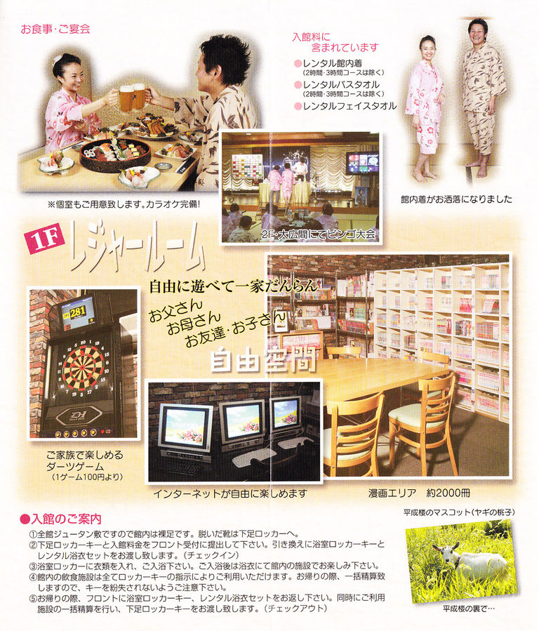 正確な数はわからないが、埼玉県は意外と健康ランドが多いのではないかと思う。歌謡ショーや大衆演劇など中高年の娯楽として愛されてきたが、全国的には年々減少の一途を辿っている。しかし、埼玉県の場合は主要街道沿いでもない嵐山町にぽつんと一軒、「平成楼」という施設があるから驚いた。嵐山渓谷天然温泉重忠の湯とあるが、嵐山渓谷は紅葉の見どころとして有名らしく、そして重忠とは鎌倉時代にこの一帯を治めた畠山重忠を指すらしい。それにしても県外の人がわざわざ訪れるような立地ではなく、よほど地元の人に愛されていないと集客力として厳しかろうと余計な心配をしてしまう。なにはともあれ実際に行ってみるしかない。外観は和風の趣で、健康ランドにありがちな派手なネオンサインは一切なく、周辺ものどかな田園地帯。到着したのは深夜に近い頃だったが、ロビーに人影はなく、静まり返っている。下足箱の鍵と引き換えにロッカーの鍵、そして館内着とタオルの入ったバッグを受け取る。パンフレットには「館内着がお洒落になりました」とあるが、以前はものすごくダサかったのだろうか。1階のレジャールーム(独立した部屋ではないのだが)には漫画本約2,000冊、スロット機、インターネットコーナーなどがあり、パーテーションを隔ててその裏側には喫煙コーナー。なぜかソファで寝ちゃう人もいて、こうした点に場末感がよく表れていると言うべきか。