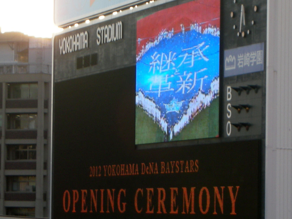 猛烈な春の嵐で今日に持ち越しになった本拠地ハマスタ開幕戦。平日とはいえ外野席は満席で、立ち見もびっしり。関内駅はベイスターズ仕様となり、球場内には立派なグッズショップもオープン。さらに外野フェンスには電飾看板が取り付けられていた。いつもより20分ほど早くスタメンの発表があり、続いてオープニングセレモニー。
