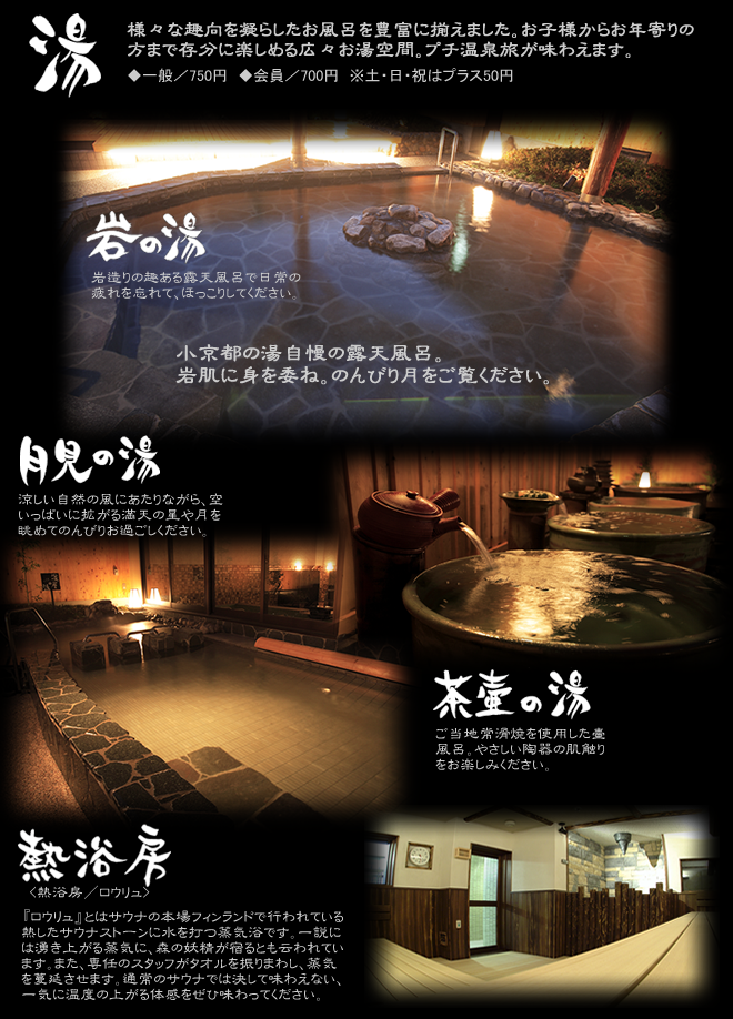¤µ¤Æ¡¢¾®µþÅÔ¤ÎÅò¤È¤¤¤¨¤Ð¡¢°¦Ãθ©Æâ¤Ç¤Ï¥í¥¦¥ê¥å¤ÇÃΤé¤ì¤Æ¤¤¤ë¤è¤¦¤À¡£11»þ¤«¤é1»þ´Ö¤ª¤¤Ë³«ºÅ¡£¶¥¹ç¤¹¤ë¶áÎÙ¾Ź¤È¸òήÀï¤â¹Ô¤ï¤ì¤Æ¤¤¤ë¡£¥í¥Ã¥¡¼¥µ¥¦¥Ê¤Ï88¡î¡¢¥µ¥¦¥Ê¼¼Æâ¤Î³Ñ¡¢¤·¤«¤â±ü¤Þ¤Ã¤¿°ÌÃ֤˥µ¥¦¥Ê¥¹¥È¡¼¥Ö¤¬¤¢¤ë¤¿¤áÀ𤮤ˤ¯¤½¤¦¡£¥¢¥í¥Þ¿å¤ò¤«¤±¤Æ¥¿¥ª¥ë¤Ç¤Î²óÀû¡ÁÇ®ÇÈ2ȯ¤ò2¥»¥Ã¥È¤Ç¡¢¤ª¤«¤ï¤ê¤ÏÇ®ÇÈ4ȯ¡£¥µ¥¦¥Ê¼¼¤Ï¹¤¯¤Ê¤¤¤Î¤Ç¡¢¸å¤í¤ÎµÒ¤¬Ç®ÇȤò¼õ¤±¤ëºÝ¤Ë¡¢Á°¤ÎµÒ¤ÏΩ¤Á¾å¤¬¤Ã¤Æ¾ì½ê¤ò¤è¤±¤Æ¤¢¤²¤ë¤È¤¤¤¦°ÅÌۤΥ롼¥ë¡£¾ïϢΨ¤¬¹â¤¤¤È¸«¤¿¡£
