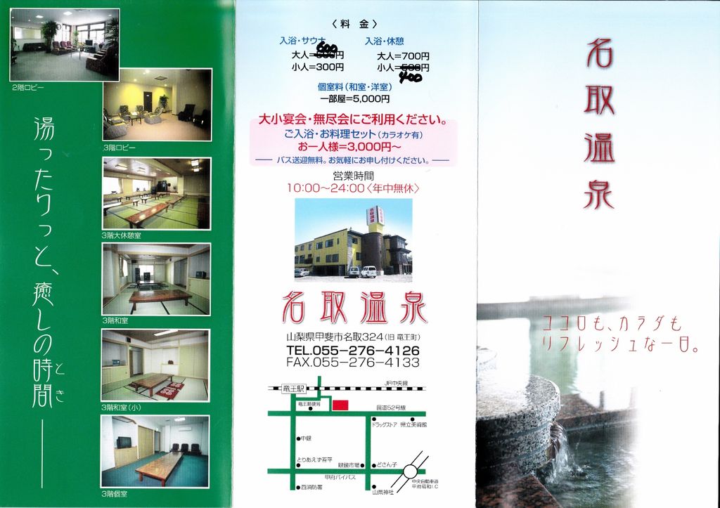 山梨県特有の習慣に「無尽」がある。地域や職場などの仲間内でお金を積み立て、会食費などに都合する相互扶助システムのことだ(同じような習慣を持つ沖縄県では「模合」と呼ばれている)。飲食店の店頭には、例えばこの時期なら「忘新年会承ります」と宣伝するところを、山梨県では「無尽承ります」の文字が加わる。無尽の場は飲食店に限ったことではなく、ここ名取温泉でも好評受付中。