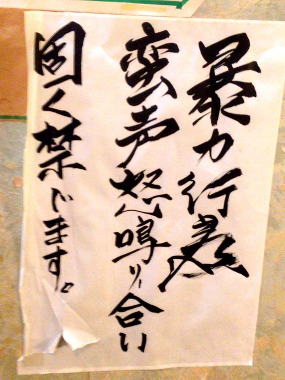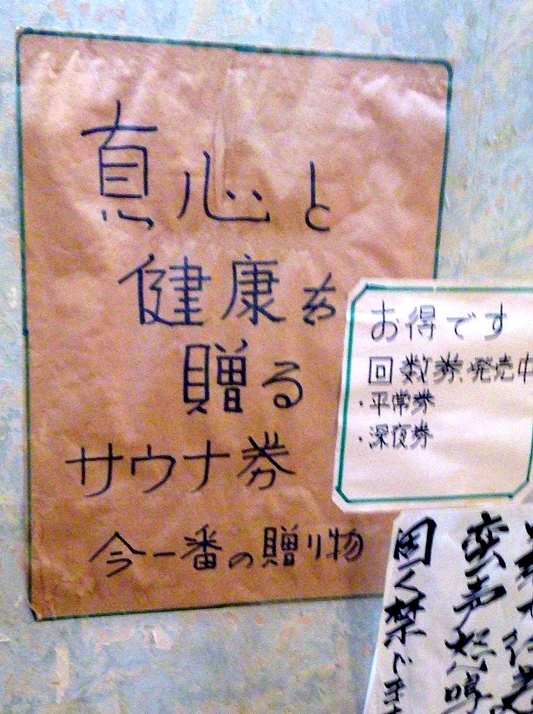 大宮にありながら「サウナ東京」を名乗るとは図々しいが、南銀座通りの繁華街にビルを構え、大宮のレジャーの一翼を担ったこの店も、今月いっぱいで約45年の歴史に幕を下ろす。エレベーターで5階へ。通りすがりの一見客を呼び込もうという意識がないのか、料金表はフロントにしか貼っていない。しかも手書きなのだが、館内はいたるところに貼り紙がなされている。盗難の注意喚起はもとより、「暴力行為、蛮声、怒鳴り合いは固く禁じます」とは、いったいどんな店なのかと。