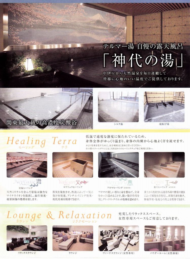リラクゼーションはアカスリやボディケアなど6種類が3階と地下2階にて、いずれも深夜営業あり。休憩スペースも3階と地下2階に、それぞれリクライニングシートを設置(3階には女性専用あり)。深夜帯に限って岩盤浴専用フロアも休憩スペースとして開放される。個室やカプセルで寝たい人や夜通しわいわい騒ぎたいグループには向かないが、禁止事項のタトゥーも含めて招かざる客のトラブルも多そうな気もする。実際はいかがなものか。