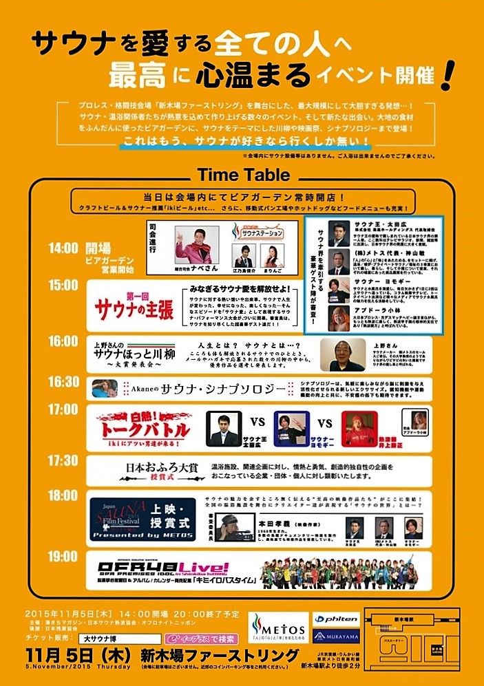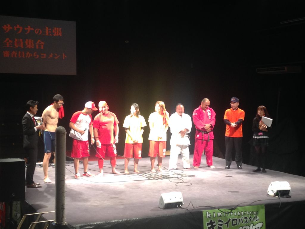 タイムテーブルは画像拡大で確認していただくとして、開始早々の「ネッパッパー」と叫びながらのスクワットでもう帰りたいと思った(笑)。サウナ愛を主張したり(動画)、サウナにまつわる川柳が発表されたり、観客参加型でエクササイズをやったり。密かに楽しみにしていた、サウナ王・サウナー・熱波師によるトークバトルはやや時間が短かったかな、と。
