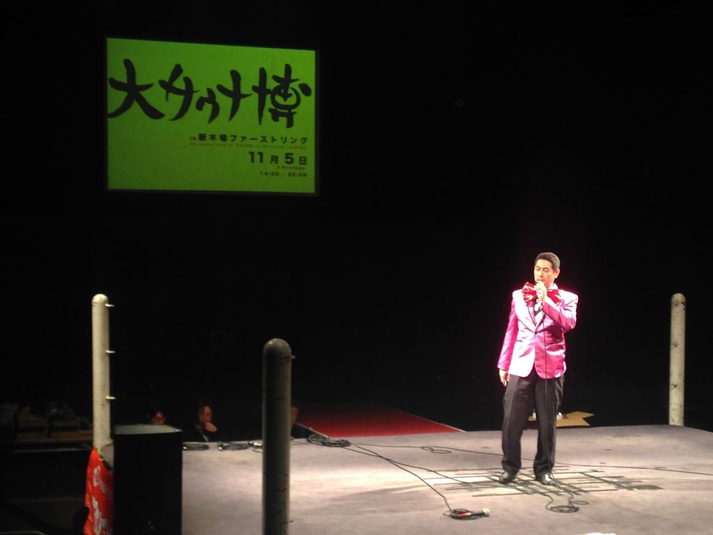 会場の新木場ファーストリングは普段、プロレスの試合が行われている。ロープこそ外されているが、雰囲気はそのまま。15時開演の時点では半分ほどが空席だったが、ほとんどがスーツ姿。温浴の業界人だ。ちなみに、リーフレットには「会場内にサウナ設備等はありません。ご入浴は出来ませんのでご了承ください」という注意書きも。