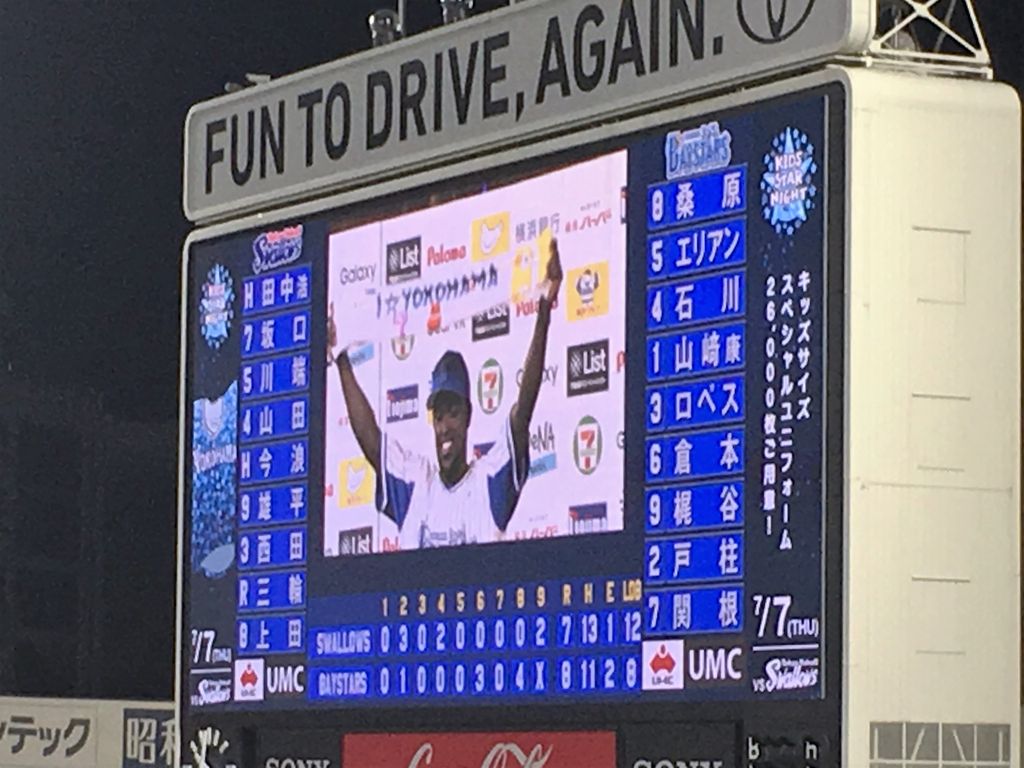 試合のキーマンはエリアン・エレラ(#42)だ。最初の失点のきっかけは、エリアンの後逸から。打つ方では打率2割そこそこで、打順は2番。せっかく獲った助っ人だけど、使い所はいまだ手探り状態。3球三振で溜息を吐かせ、3打席目にしてようやく飛び出した本日初ヒットは外野フェンス直撃。ロペスの一発などで1点差まで詰め寄り、そして迎えた8回裏。ヤクルトのピッチャーは4人目のルーキ。山田の送球エラーをきっかけに塁を埋め、2アウト満塁のフルカウント。押し出しでもいいとスタンドが祈るなか、高々と舞い上がった打球は、見事にスタンドイン。