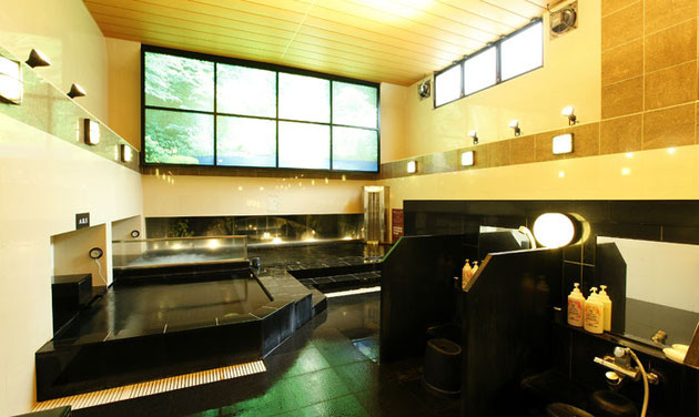 浴室内は洗い場と湯船を黒いタイルでまとめたシックな空間。鉢植えの造花を飾ったりと気を遣っている一方で、出しっ放しのポリッシャー、そして故障中の水飲水栓。バックヤード(機械室)のドアも外され、プラ段での応急的な仕切り。何かしら壊れているのは「サウナあるある」かもしれないが、これではスパリゾートの名が廃る。島列で並んだ洗い場の奥には、北海道二股カルシウム温泉の湯船。大きな人工温泉装置を備え、また湯船の一部をバイブラ湯にしている。そして3〜4人が精一杯の水風呂。(浴室の写真はスパリゾートプレジデント公式サイトより転載)