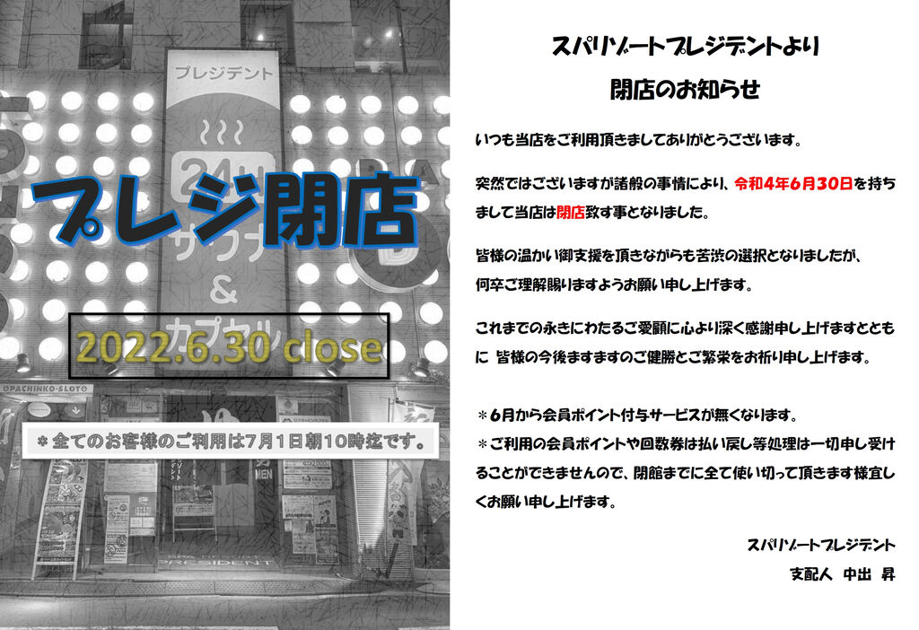 上野界隈には低料金が魅力のサウナ店が多い。どこも施設としては小ぶりで、パチンコ店の上階(つまりは副業)だったりして、なんとなく雰囲気が似ている。スパリゾートプレジデントも名前こそ立派だが、自作の無料ホームページだし、ビルの屋上看板には思いっきりサウナと書いてある。入口はわかりやすくも庶民的な「ゆ」の暖簾。3時間コースなら1,000円とサラリーマンの財布に優しい。上野松坂屋や吉池の裏手にあって、御徒町や上野広小路の駅至近とアクセスの良さも見逃せない。