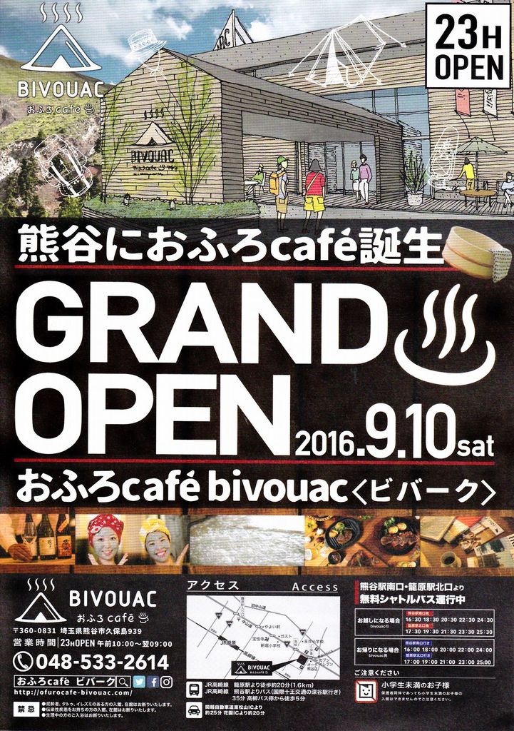 既成概念ならば充実した風呂がメインで、休憩施設はサブ。しかし、ビバークでは、おしゃれで楽しい空間の一部分に風呂があると考えるべきか。「家は3回建てないと満足できない」と言うが、おふろcafeも3軒目にして自由すぎる発想はさらに進化。疲れる日常から逃れる(ビバーク)するのに、熊谷という地は都会から程よい距離感だ。グラマラス(Glamorous=魅力的な)とキャンピング(Camping)を掛け合わせた「グランピング」という言葉を造ってしまうあたり、もはや時代の仕掛人。そして、10/1には神川町の白寿の湯が「おふろcafe 白寿の湯」として生まれ変わるというのだから、温泉道場の勢いは止まらない。