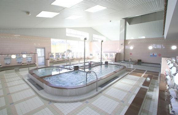設計会社や年代によって既視感を憶えることもあるが、浴室は神奈川県の湯快爽快ちがさきと瓜二つ。真四角の浴室の周囲に洗い場を設け、石の長椅子、プッシュ式のカラン、シャワーフックの位置が高く、腕をめいっぱい伸ばさざるをえないのはご愛嬌。浴室中央にジェットバスやバイブラ湯を配置しており、炭酸泉や替わり湯が無いのは残念。(浴室の写真は公式サイトより転載)