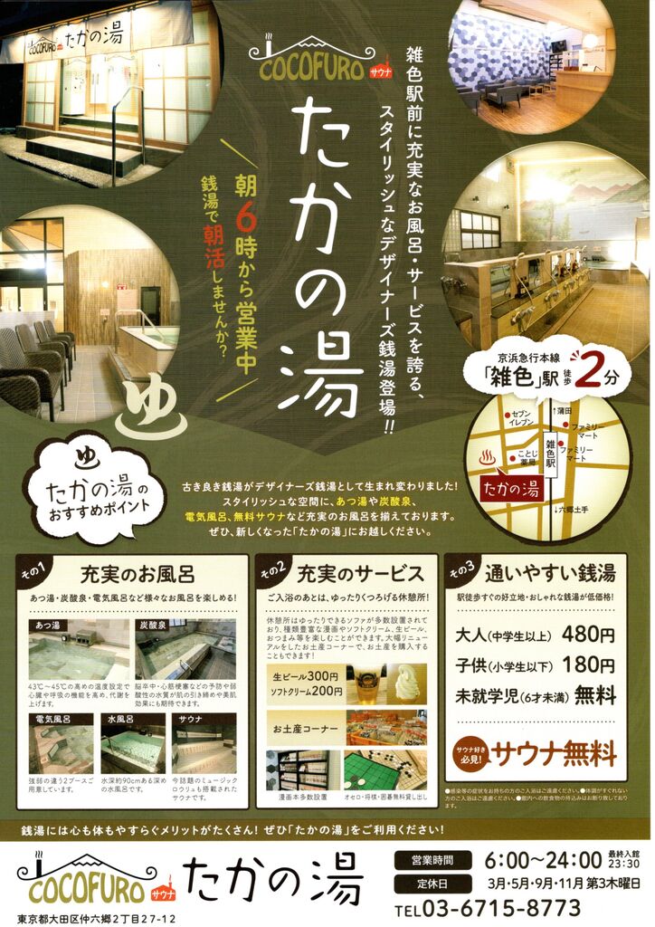 雑色の地名は鎌倉時代までさかのぼり、宮中の雑事を担う職業に由来するという。現在は六郷地区となり、雑色の名は駅や商店街に残すのみ。その六郷も明治時代、雑色村を含む6村合併(実際は5村)によって、新たに名付けられた地名だとか。雑色駅は高架化で駅前広場はがらーんとしているが、すぐに庶民的な商店街が顔を見せる。芝信用金庫の角を曲がれば、今回お目当てのCOCOFUROたかの湯。久が原のCOCOFUROますの湯とは姉妹店で、温浴施設運営には定評のある楽久屋が引き継ぎ、改装を経て生まれ変わった。朝湯営業を行っている銭湯は都内にちらほらあるが、ここは早朝6時より閉店までの通し営業。しかも毎日。一番風呂を楽しみたい年配客、出勤前のサラリーマンの来店が落ち着き、本来なら土曜日の10時なんて週末であっても平和な時間帯。そんな世間一般の状況は当てはまらず、店内は若い客層で賑わっていた。もちろん彼らの目的はサウナ。改装前から無料で利用できたが、ベンチの数を増やし、オートロウリュ仕様となったことで、注目が集まっているのだ。