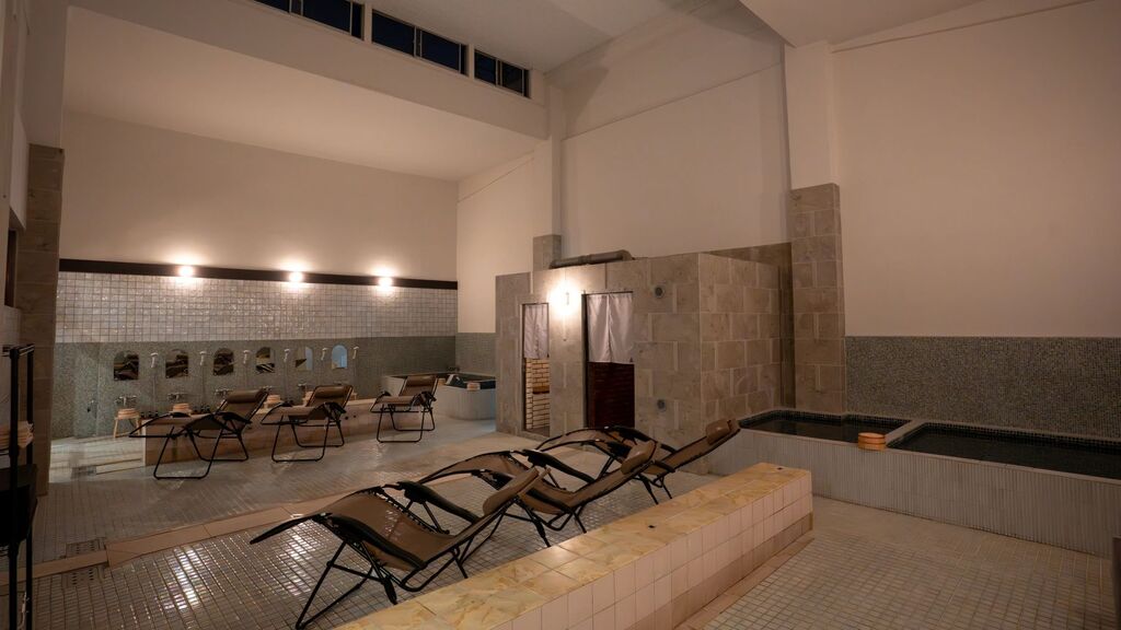 脱衣所はかつて女性側だけを活かし、男性側はサウナ室を新たに設けた。洗い場は一列分だけ配管を残して水栓器具を新調。島列だった箇所は立ち上がり部分だけ残している。湯船はかつて女性側だった2つ(浅・深)が温かく、男性側だった2つが水風呂に。そして、もとからあったサウナ室2つ(男女)は、ヒーターもろとも撤去されずに残されていた。言うなれば小休憩室。男女をぶち抜いた浴室はがらーんとして寒いので、ヒーターを付けてくれてもいいのに。