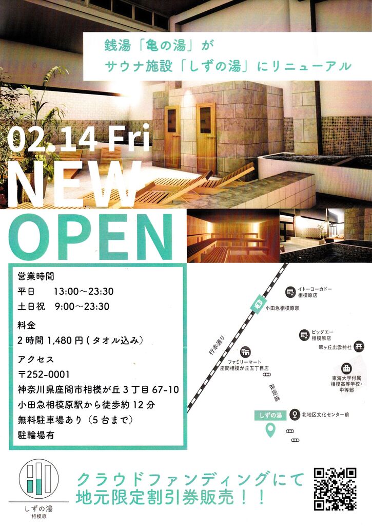 昨年5月末に閉店した座間市相模が丘の亀の湯。客のマナーの悪さが閉店に至る大きな理由だったようだが、戸建の多い住宅地の奥まった立地で、湯船のタイルが剥げ落ちるなど店内あちこちが老朽化している点も気になった。創業57年という時代の流れで個人的には閉店やむなしではないかと思ったが、サウナ店として2/24に改装オープンとなった。