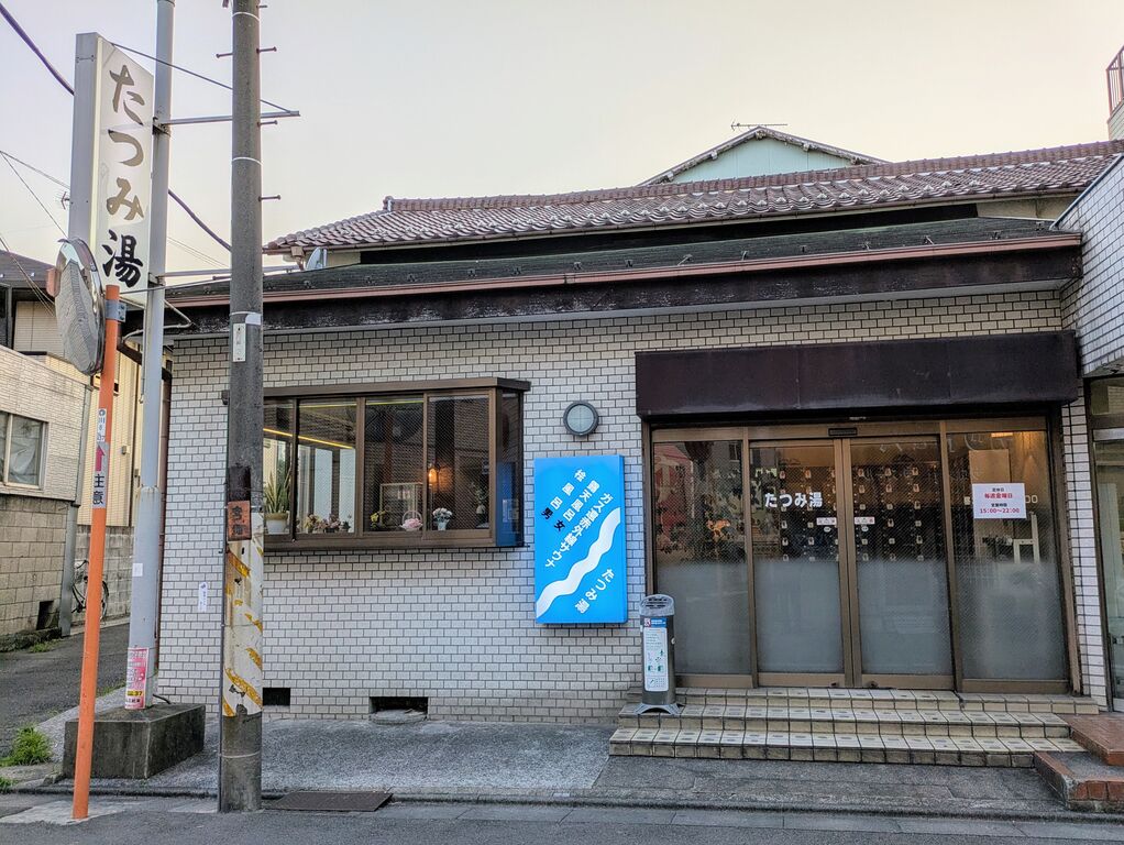 南武線浜川崎支線の小田栄駅が最寄りの銭湯といえば、駅から北に歩くと以前紹介した栄湯。南に歩くと新旧の戸建住宅と個人商店が建ち並び、そして辰巳湯。駅から真っすぐ500m、小田5丁目バス停もすぐそば。典型的な町の銭湯風情で、コインランドリーも併設。フロントで料金を支払い、サウナ利用の際は下足箱と引っ掛け鍵を交換する。