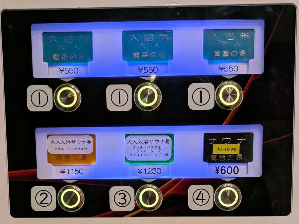 まず券売機でチケットを購入するが、カラフルなプラスチック札が懐かしい感じ。サウナは別途600円でタオルセット付き。浴室にシャンプーやボディソープの設置はなく、セットにするならプラス80円の1,230円。この街でサウナといえば鷹番の湯とサウナミナミだけなので、サウナ室は常に客でいっぱい。塩サウナなのに、塩を使わない客がほとんど。水風呂は2人だと窮屈なサイズ感で、休憩は露天風呂のわきに椅子1脚。