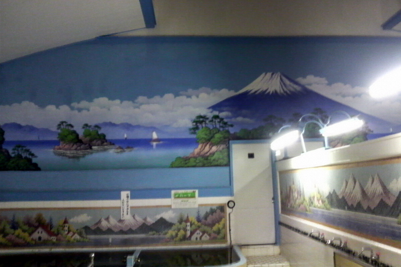 (追記09/12/12)-----ひさしぶりに訪れたら湯船には熱湯が並々と湛えられていた。深湯のほうは温度計が46℃を指しており、さすがに無理。「最近のスーパー銭湯は燃料費をケチってるから、ぬるくてしょうがない。あんなの入った気がしないよ」とは、番台のおばちゃん談。キップのいいお方だ。ペンキ絵も描き替えられていた。女湯とにまたがって大きな富士山が描かれ、海上には松の小島が浮かんでいる。丸山清人師の作品で、西伊豆の風景だ。営業時間は30分短縮され、22:30までとなったので訪れる方はご注意を。