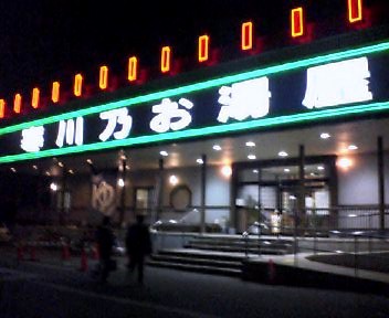 寒川乃お湯屋というスーパー銭湯に行った。うちから国道129号線の田村十字路を経由して約40分。JR相模線の宮山駅前という立地。「ゆ〜ゆ」というフリーペーパーによると開業2周年、ということで風呂は若干こじんまりとはしているがきれい。たいていテレビはサウナにあるのが普通だが、ここでは露天風呂にある。そのおかげで湯につかりながら、またはデッキでごろんと横になってテレビが見れるという贅沢。これもまたよし。
