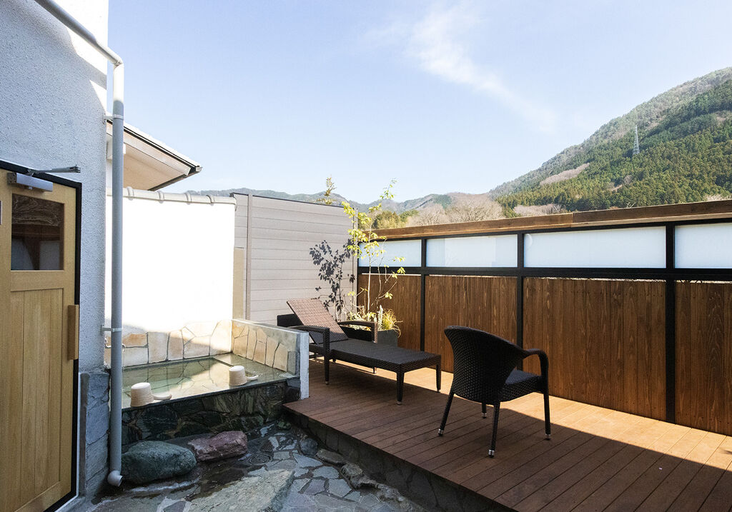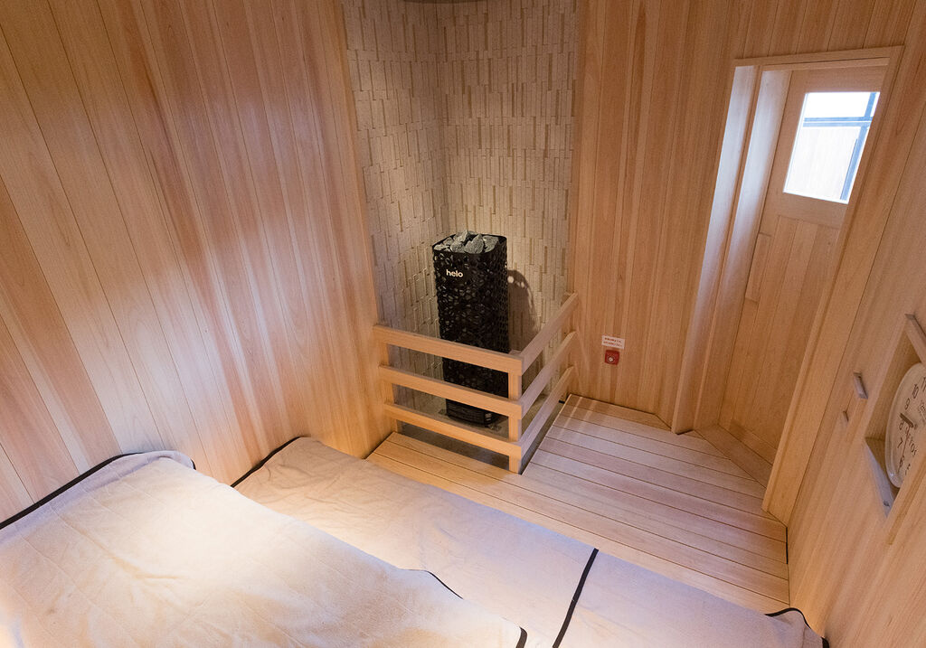 浴室には内風呂、替わり湯、ジェットバス、水風呂。そしてタワー型の高温サウナとスチーム塩サウナ。ベンチの板にかなりの年季を見て取れた。露天には椅子が6つしかないが、サウナ客には足りている様子。寝転びのデッキもあるし、なにより露天スペースはゆったりとして開放感もある。