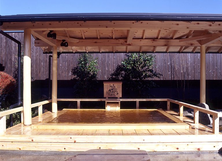 そして、露天には檜風呂とそこから温泉が流れ落ちる岩風呂、さらに壺湯が3つ並ぶ。温泉は無色透明、檜風呂と壺湯は循環ろ過なしのかけ流しとあって豊富な湯量が自慢だ。七福神の縁起にあやかって、各湯船は毘沙門天の湯、弁財天の湯などと名付けられ、説明文が掲示されている。7種類の湯船かと思ったら、ジェットバスと水風呂は除外され、その代わり壺湯は1つずつ。おそらく温泉を使用した湯船なのだろう。