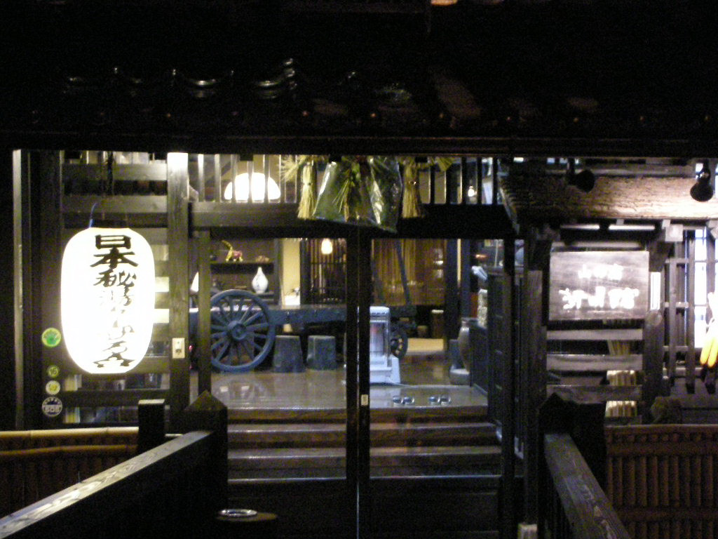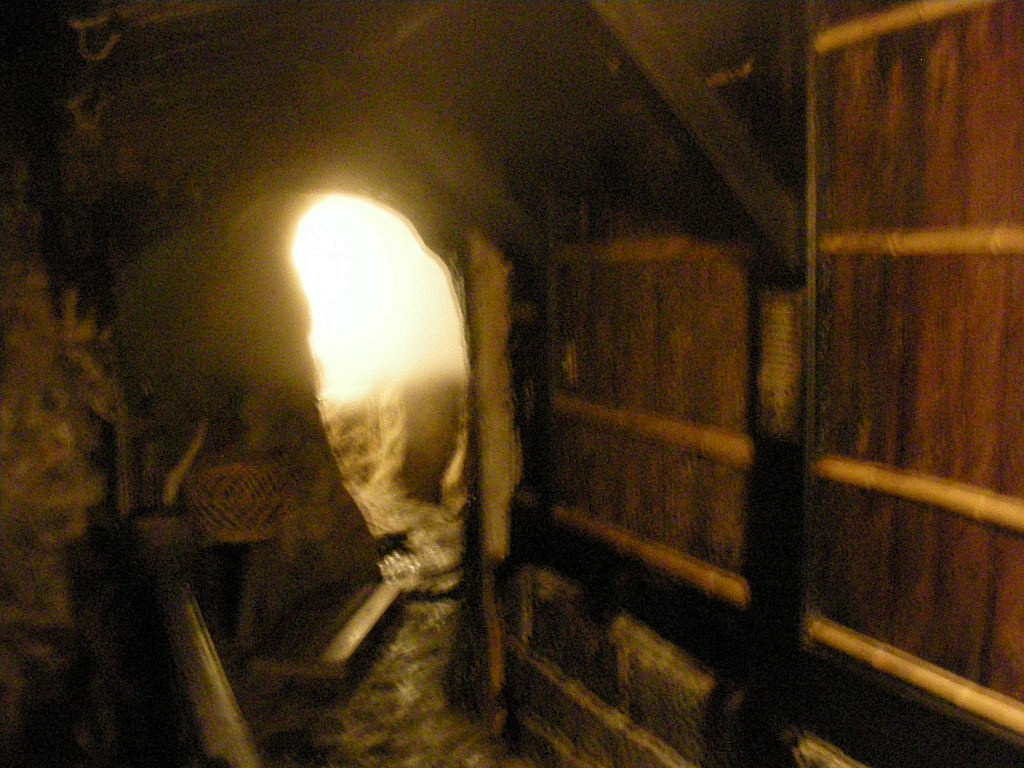 神明館も日本秘湯を守る会の会員宿。玄関先にはそれを示す提灯がぶら下がっていた。日帰り入浴の場合、玄関先で料金を支払い、外の通路から浴室へ行く。調理場の脇を通り、囲炉裏のある休憩所を通り、そこから先は石畳の遊歩道となっている。まずは神明館の名物ともいえる「洞窟風呂」へ。
