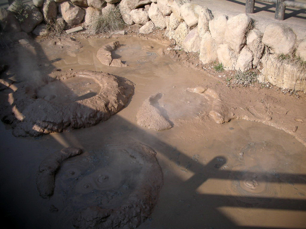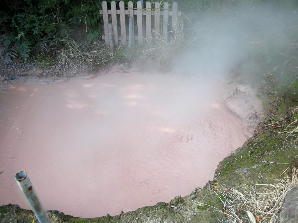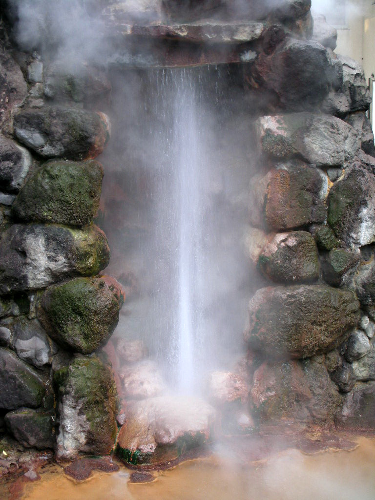 地中の熱水の圧力による間欠泉が30〜40分間隔で見られる。熱湯が飛び散るので噴出孔には石の天井が設けられているが、50mほど噴き出す力があるという。別府市の天然記念物されている。