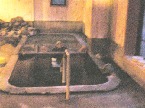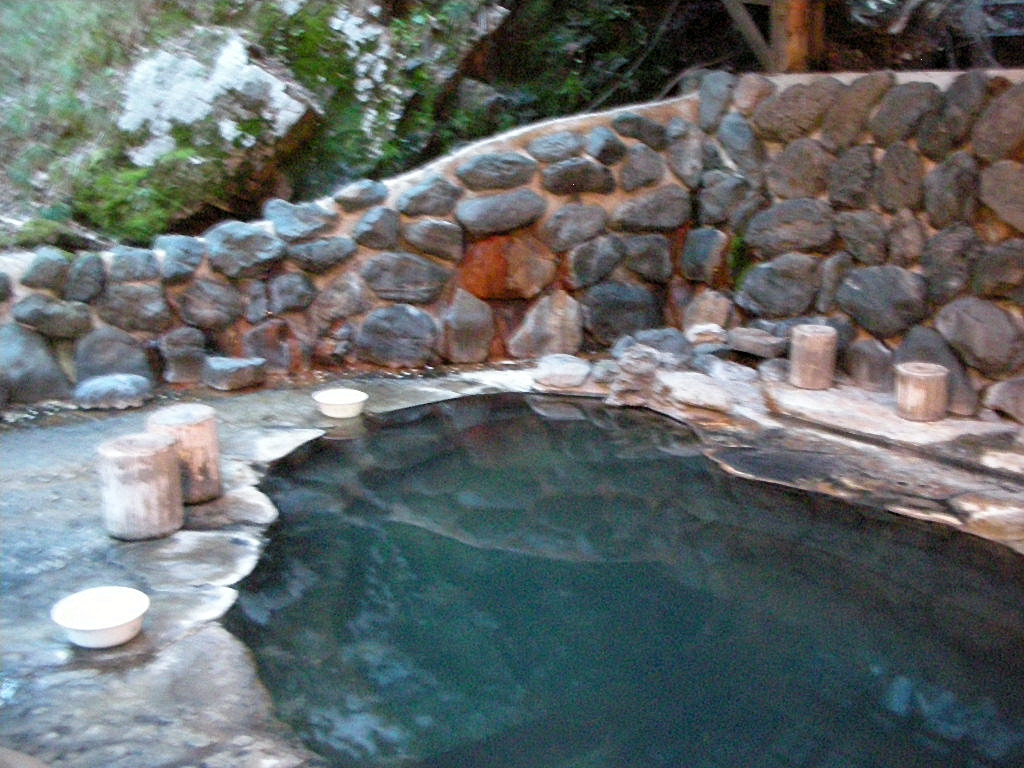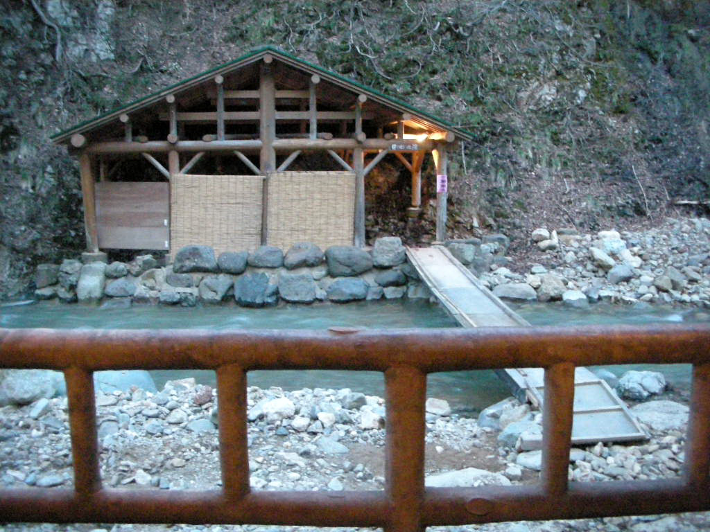 まず初めに「真湯」に入浴。入口こそ男女別に分かれてはいるが、棚だけの簡単な脱衣スペースの先に湯船が1つ。源泉は湯船の底から湧いており、新鮮なお湯がかけ流しとなってあふれている。40℃以下でぬるく、湯船も浅いので余計に寒く感じた。川はすぐそばに流れ、ざあざあという音が聞こえるのみ。対岸には「女(目)の湯」があるのだが、向こうにはすだれが掛かっているためご対面なんてことはない。そもそも客なんぞいなかったが。土手側の斜面は玉石積みの擁壁となっている。