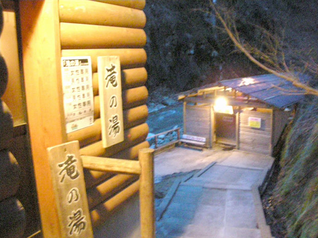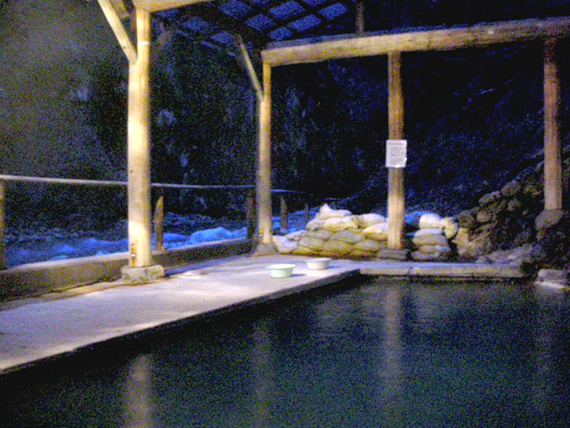 続いて入浴したのは「大湯」だったが、湯船のつくりや景色はほとんど変わらない。唯一異なるのはお湯がかなり熱めだということ。それでも43〜44℃といったところか。我慢できないほどの熱さではないし、冷えた身体にはこのくらいがちょうどいい。真ん中の写真は女性専用(男性専用の時間帯もあり)の「滝の湯」だが、こちらは露天風呂というより、内風呂のつくり。こちらもかなりの熱さだったらしいが、100mも離れていないのに泉温がこんなに異なるのだから不思議だ。辺りはもう真っ暗になってしまったが、湯船には電球のぼんやりとした明かりが灯るだけ。水面に反射してゆらゆらと揺れて幻想的。夏の日差しでお湯が油のように見えたという話も、なんだかわかる気がする。