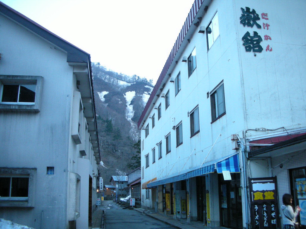 元湯夏油は旅館と自炊棟の複数の建物から成り、露天風呂には左右に並んだ建物の間の通路を行く。申し訳程度に食堂や売店もあり、ここだけひとつの集落のような雰囲気だ。営業開始初日とあって客が少ないのか、ゴーストタウンのように静まり返り、帰りなどは足元がおぼつかないほど真っ暗。つげ義春の漫画に出てきそうな光景だが、調べてみるとやはり昭和44年に訪問済み。ところで、いくつかある建物の中で「昭和館」だけは経営が別だというから訳がわからない。違和感なく軒を連ねているのだが。