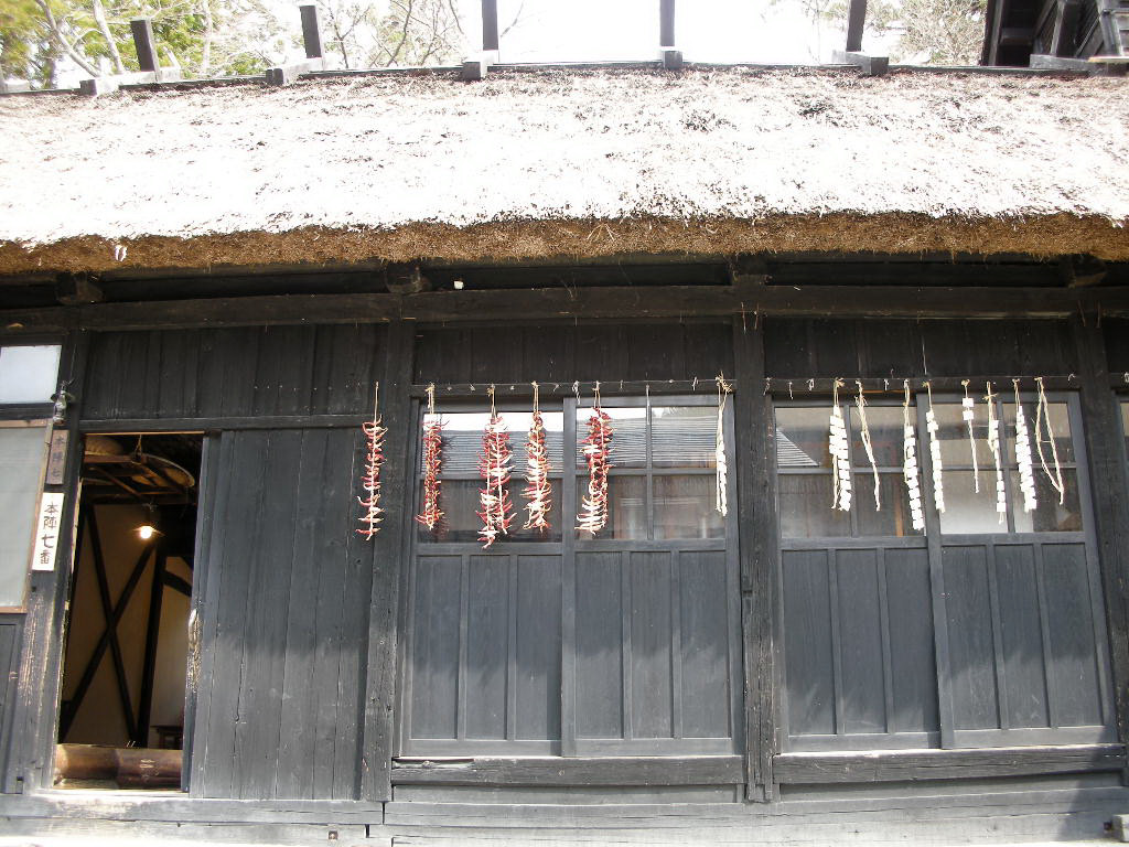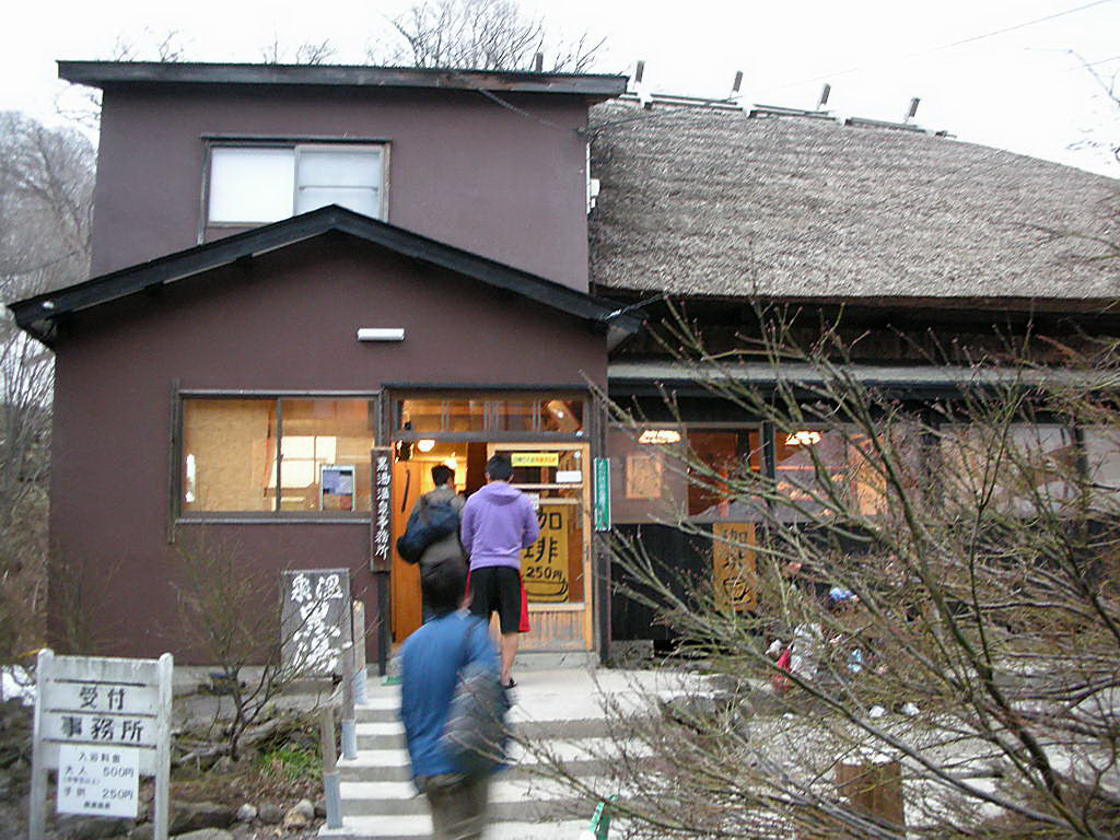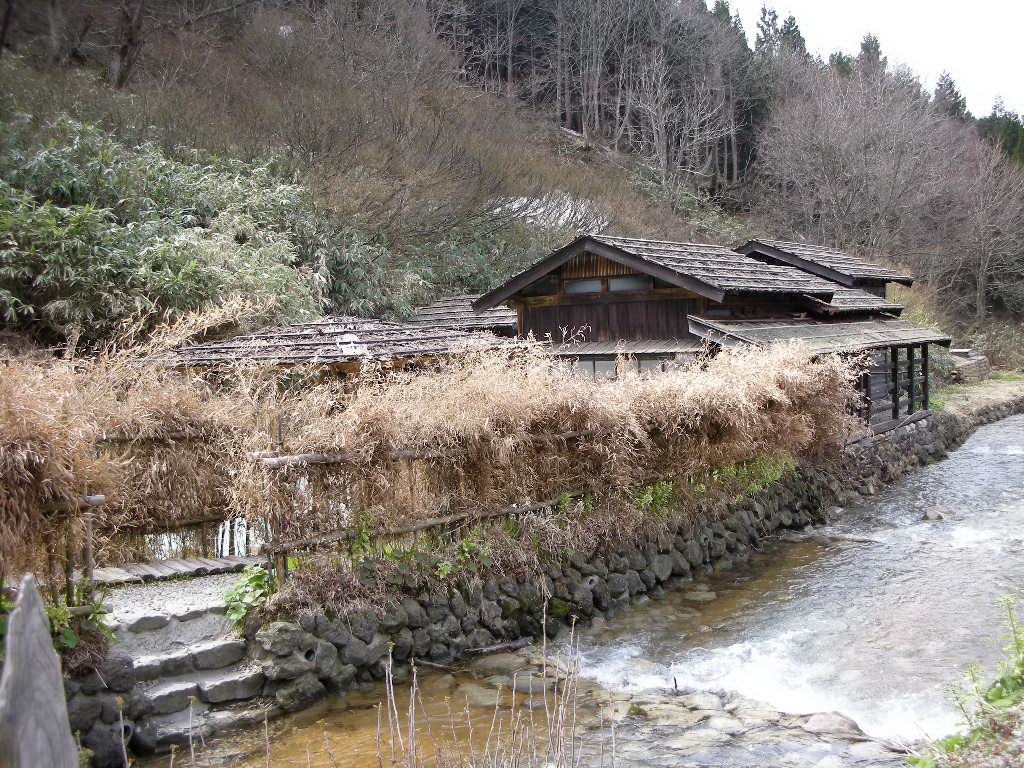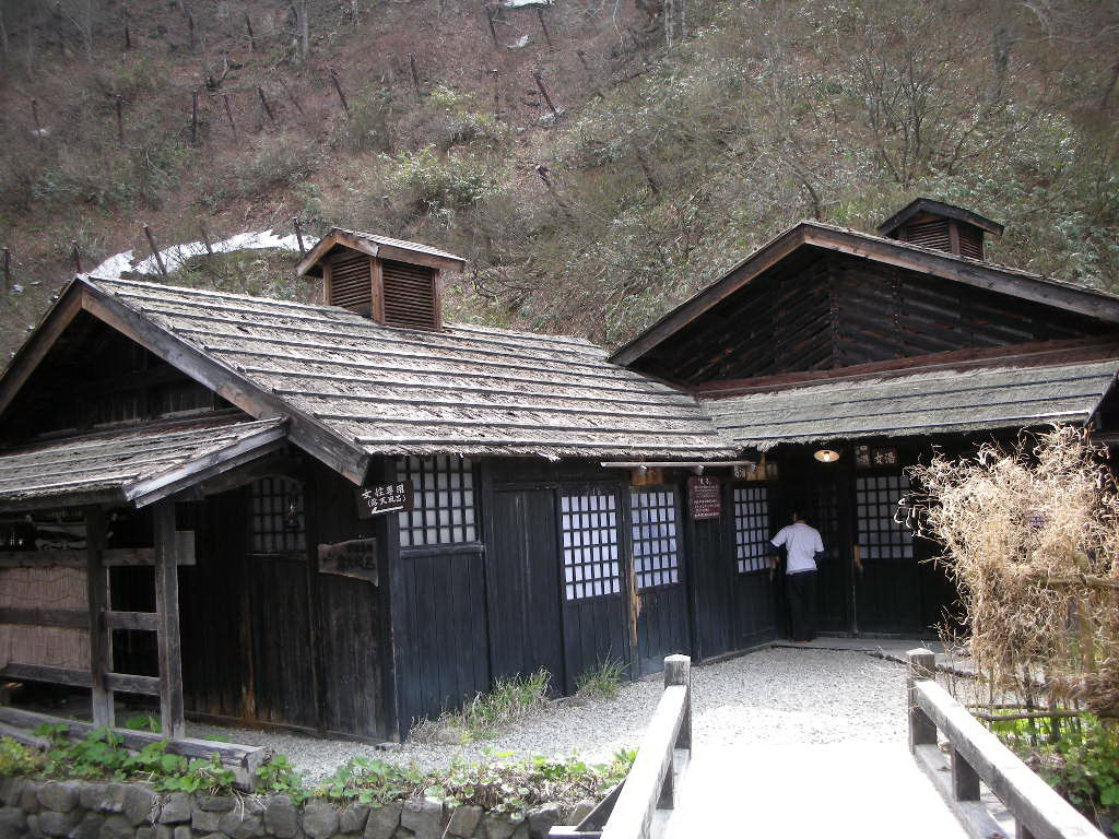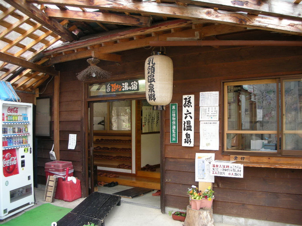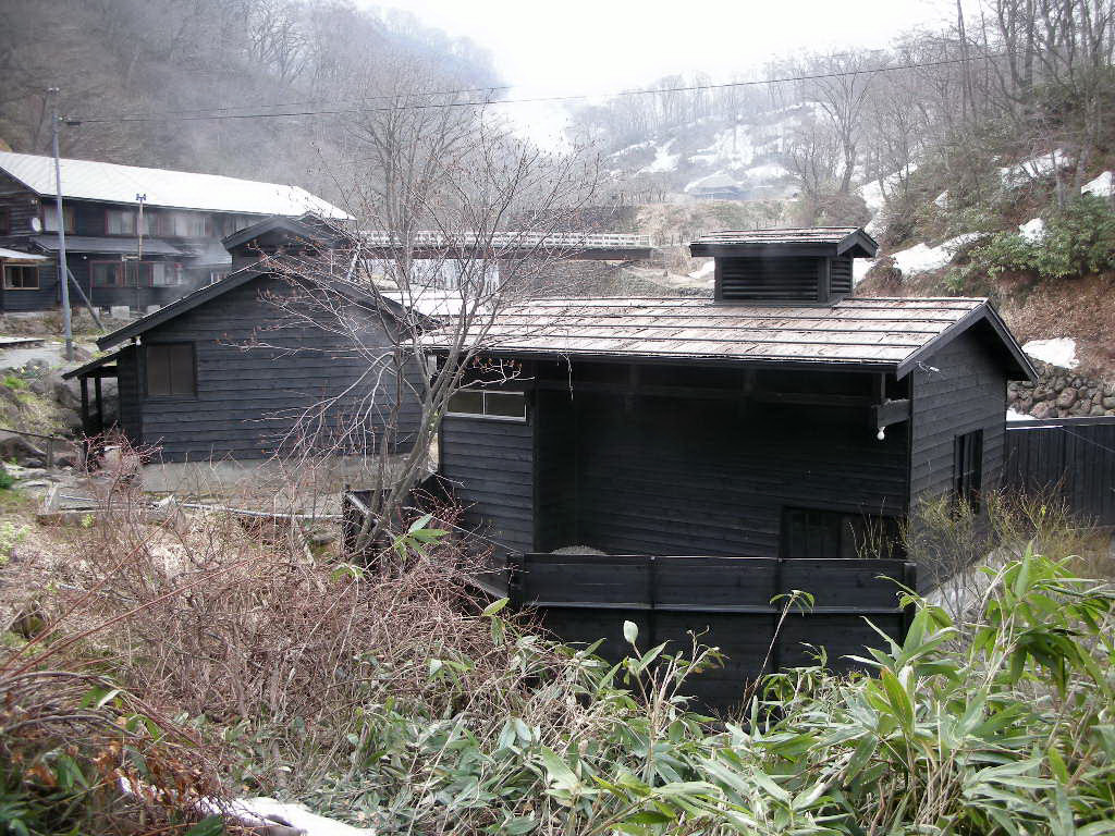 孫六温泉の浴室は「唐子の湯(内湯)」「石の湯(内湯+露天風呂)」。受付には「お風呂場の略図」が貼ってあるが、別の貼り紙にある「お風呂の位置は全部まわれ右して左下側です」のほうがわかりやすい。要するに川に面した側に2つの浴室はある。屋根に湯気抜きが設けられ、まさに湯小屋といった感じの建物だ。