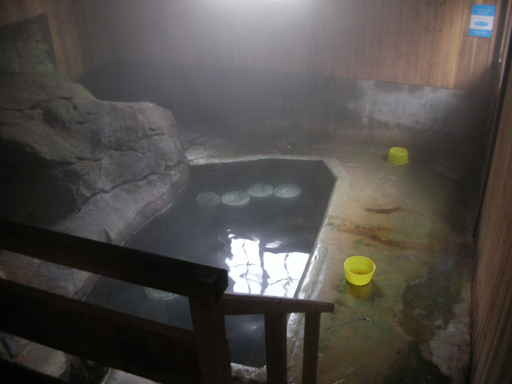 唐子の湯も石の湯も浴室内の壁は板張りだが、床はコンクリートを打っただけ。湯船に湛えられた温泉は、ほぼ無色透明で、わずかに白い湯の花が舞っている。しかしその成分によって床は緑や茶に変色し、素っ気ない浴室に味わいを添えている。薄暗い室内にはまぶしいくらいの日が射しこみ、陰影が鄙びた雰囲気をより一層濃くしている。湯船の底には「腰掛けるために使え」ということなのだろうか、重り石やコンクリートブロックが沈んでいる。きれいに並んでいるとは言えない感じが、なんとも微笑ましい。