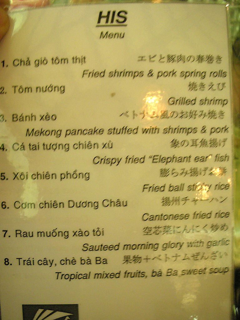 昼食代はツアー料金に込み(飲み物代を除く)。ミトー名物だというエレファントフィッシュは、身をほぐしてライスペーパーで巻いて食べる。なかなか上品な料理ばかり。さすが高級店だ。14:20頃にミトーをあとにし、うとうとしたと思ったらホーチミンシティに到着。ツアーはドンコイ通りで解散した。