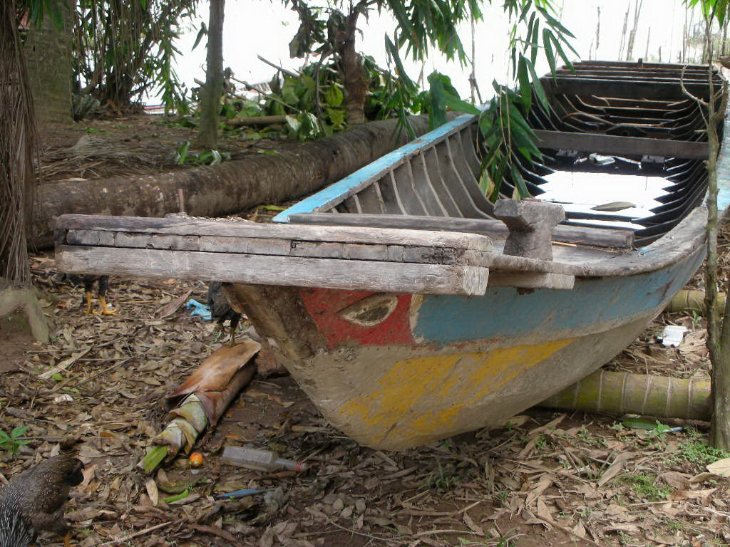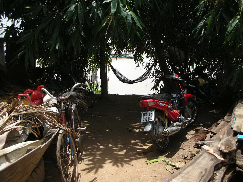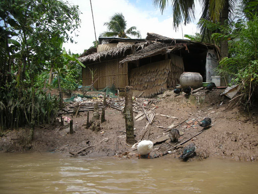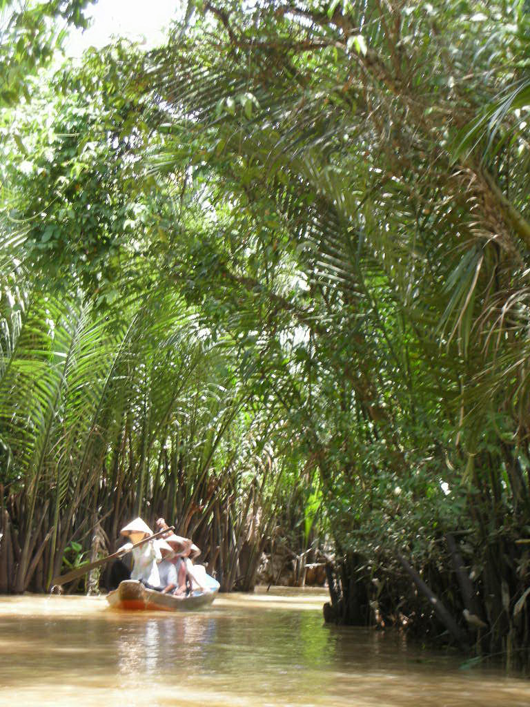 前回のつづき。タイソン島でフルーツを食べたあとは、いよいよ小船に乗って本題のメコン川クルーズだ。定員4人のボートには、漕ぎ手が前後に2人付く。ニッパヤシが頭上に覆いかぶさるようにして茂る風景は、まさに熱帯のジャングル。漕ぎ手のおばちゃんは途中で何を説明するでもなく、ただひたすら漕ぎ続ける。観光のボートは片道の乗船であるため、対向するのは回送のボート。それこそひっきりなしにボートが運航するのだが、ここは生活水路でもあり、たまにヤシの切れ目からは簡単なつくりの民家が姿を見せる。