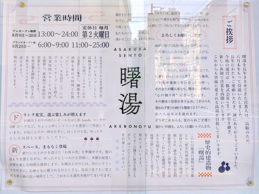 台東区入谷は江戸時代までは田んぼの広がる農村だったという。明治になって植木職人が朝顔の品種を競い、いまでは入谷の朝顔市と知られている。低層マンションが多く建つ住宅地で、表通りには老舗店舗もちらほら。白水湯もマンションの1階で営業しており、1年7か月の長期休業を経て、昨年3/7にリニューアルオープン。鶯谷で人気を集める萩の湯の系列店となった。外観はモノトーンに一新され、しやまれた雰囲気に。店内は明るく温かみがあり、銭湯になじみのない若い世代の受けも良さそうだ。