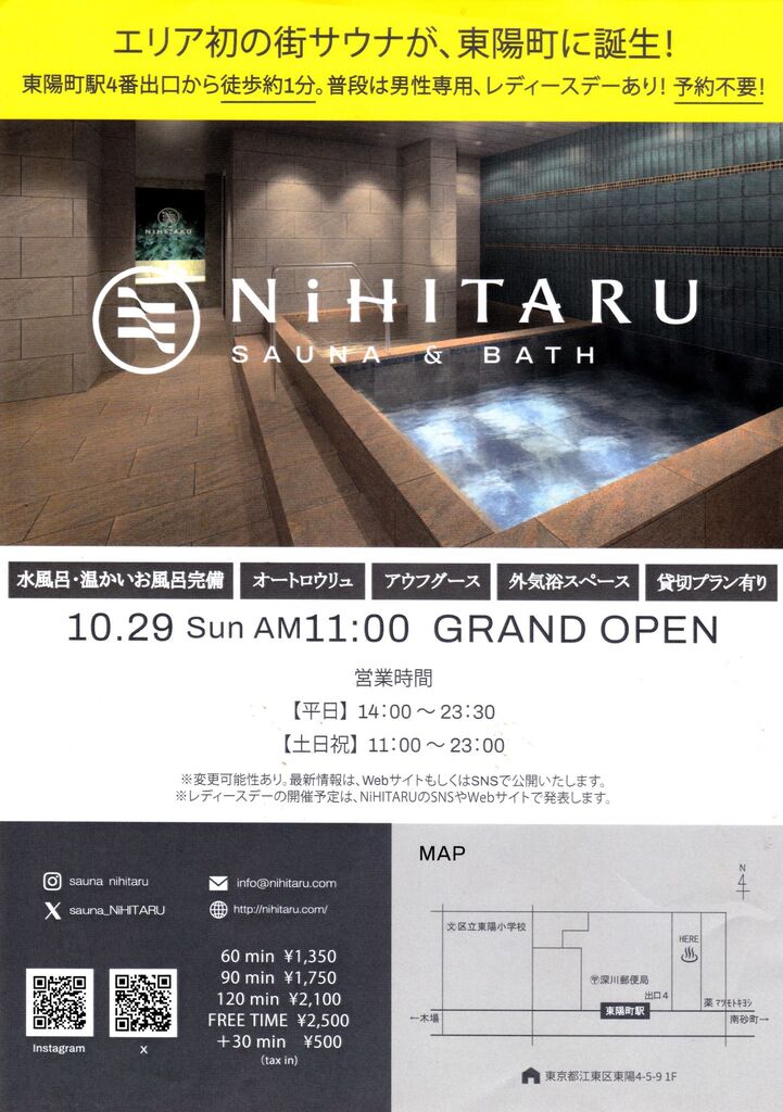 江東区役所のお膝元・東陽町駅は、東西線1路線なのに乗降客数10万人だという。地下鉄駅であるためか、駅前の賑やかさはなく、この街に新たに誕生したサウナ「NiHITARU」も徒歩1分の好立地なのに通りかかる人はまばら。新築マンションの路面店で、家賃が高そうだと余計な心配をしてしまう。男性専用サウナなのに女性オーナーというのも興味深い。受付で利用時間を選んで料金を支払う。今回はハシゴだったので60分にしたが、タオルレンタル込みだし、最近では町の銭湯でもサウナを追加したらゆうに1,000円を超える時代だ。限られた広さにアイテムを詰め込んでおり、脱衣所では忙しなく服を脱ぐ。洗い場4つは背後が通路。サウナ、水風呂のほか、いまどきの小規模店では無視されがちな温かい湯船も。そして、椅子6脚が整列し、その奥にはわずかな広さだが外気浴の空間も。