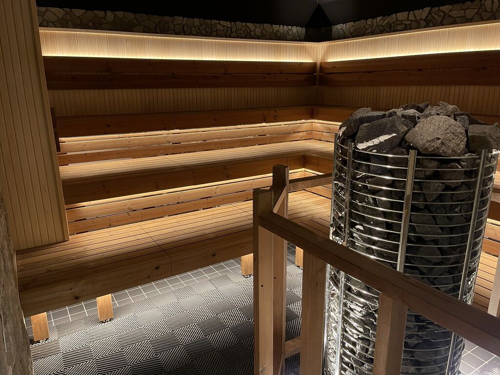 サウナ室はL字型に3段のベンチを設け、20名ほどが座れる広さ。円筒形の石積みヒーターは20分おきにオートロウリュがあるし、熱波師を招いてのアウフグースイベントも時折り開催しているそう。薄暗く雰囲気のある照明の下で、じっと汗を流すのは若者ばかり。水風呂はやけに深いなと思ったら、なんと150cm(女湯は130cm)もあって、大袋に入った備長炭が沈んでいる。わずかな空間だが畳の休憩スペースには送風装置も設けられている。