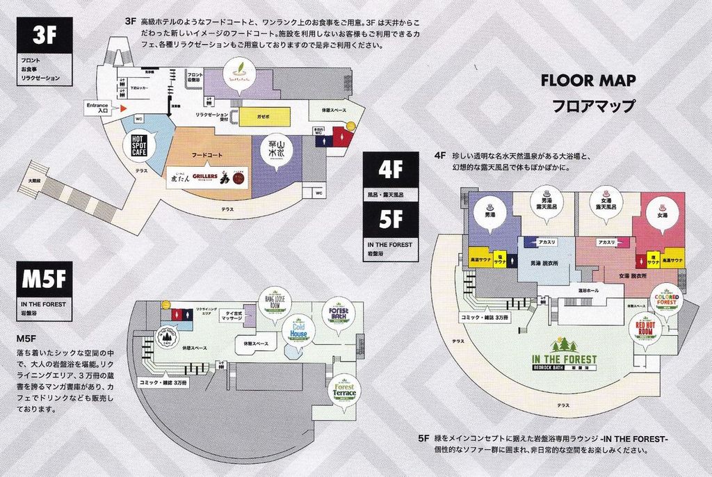 飲食、浴室、岩盤浴はフロアとエリアで分けており、縦と横の動きで広い館内に活気を生み出している。開放的な吹き抜けが印象的で、どこからでも館内を見渡せる感じもよい。細部までしっかり作りこんでいて、ひとっ風呂だけの客も、長時間滞在でゆっくりしたい客も、ひとりでも友達や家族でも、目的や場面に応じて、掛け算式に楽しみ方が広がっていく。