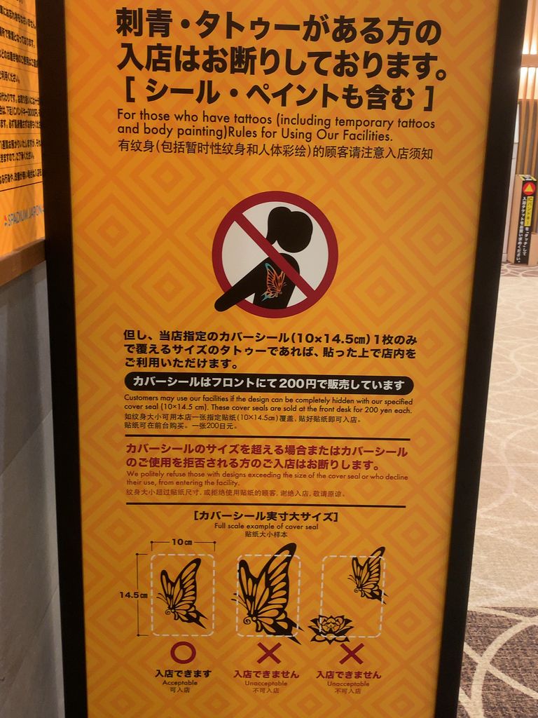 スーパー銭湯では珍しく、タトゥー客の入店も認めている。フロントで販売しているカバーシール1枚(10cm×14.5cm)で隠せる大きさであれば、という条件付き。この店舗での効果検証次第では、今後の業界の流れは変わるのかもしれない。