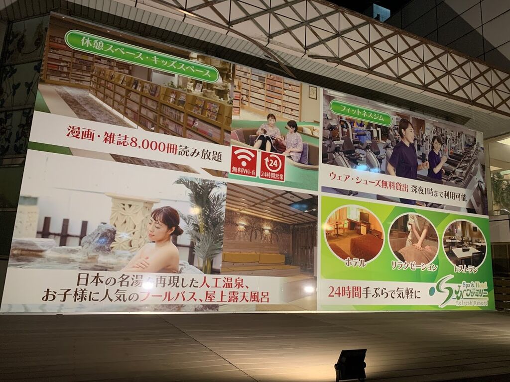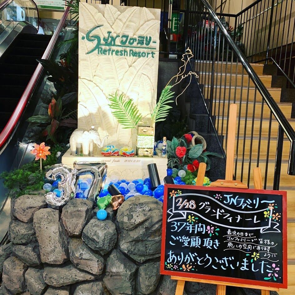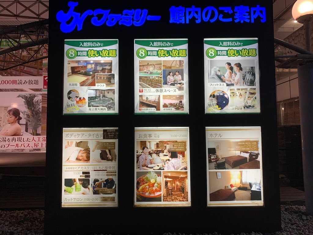 3階にはレストランとバー、ゲームコーナー、畳敷き休憩室がある。食事メニューは豊富に揃えており、価格設定も良心的。ドリンクバーがあるのも嬉しい。4階にはリラックスルーム(共用・男女別)があって、個別テレビ付きのリクライニングシートが多数並んでいる。5~9階はホテルの客室。このほかにマッサージやエステなどを備えており、設備やサービスはかなり充実していると言える。入浴やフィットネス、エステなど、いろいろな角度から楽しめるのがJNファミリーの魅力なのだろう。休日をのんびりと過ごしたい人にはうってつけのレジャー施設だ。JNファミリー