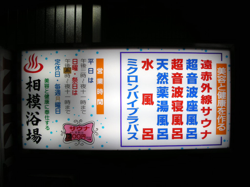 最上階の10階にもお風呂があるのだが、それを知る人が少ないのか、着替えたりするのが面倒なのか、いずれにせよ客は少ない。ここには岩風呂風の湯船があって、ガラス張りの屋根が覆っているが露天風呂として楽しめる。近隣ではいちばん高い建物のようで、ビルやマンションの建ち並ぶ相模原の市街地を西と南に渡って眺める。10階には「酵素風呂」もあるのだが、こちらは別料金(1,500円)。酵素を混ぜた大鋸屑の中に、砂蒸し風呂のようにして横たわる。エレベーターホールの目の前にあるのだが、あたりにはビールのようなにおいが立ち込めている。