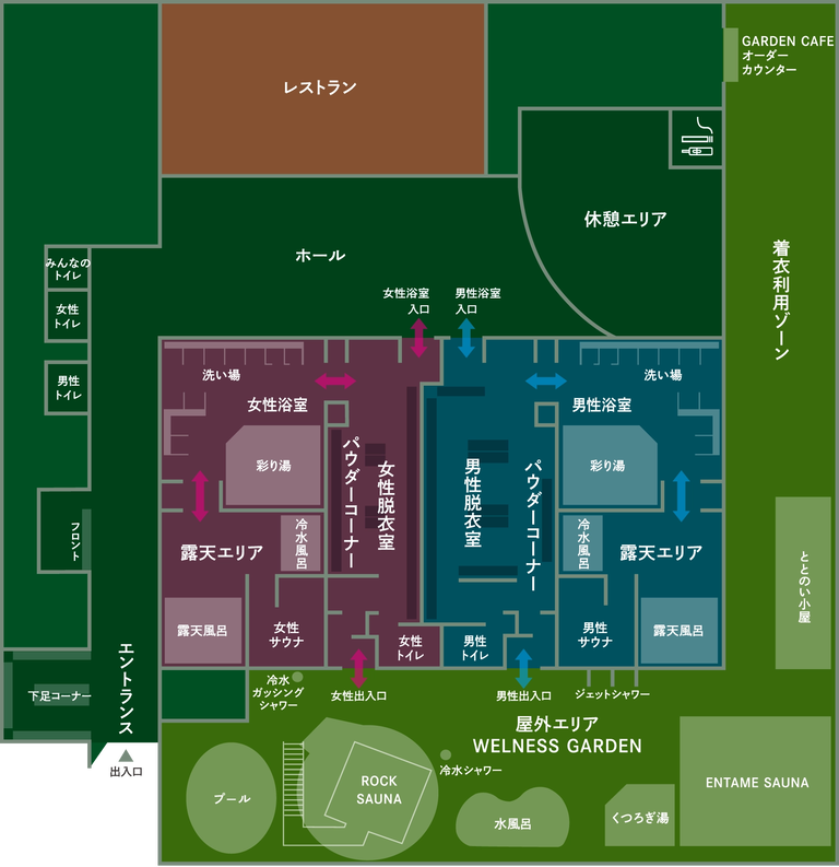 æ°á½ê¤Ë¤Ï2¤Ä¤ÎÈ⤬¤¢¤Ã¤Æ¡¢Íç¤ÇÍøÍѤ¹¤ëÍá¼¼¥¨¥ê¥¢¡¢¿åÃå¤ÇÍøÍѤ¹¤ë²°³°¤Î¥µ¥¦¥Ê¥¨¥ê¥¢¤ËÄ̤¸¤Æ¤¤¤ë¡£Íá¼¼¤ÏÀö¤¤¾ì¤Î¿ô¤â¾¯¤Ê¤¯¡¢¤³¤¸¤ó¤Þ¤ê¤È¤·¤Æ¤¤¤ë¤¬¡¢ÆâÅò¤ÈϪŷÉ÷Ϥ¤Î¤Û¤«¡¢¥µ¥¦¥Ê¤È¿åÉ÷Ϥ¤â¤¢¤ë¡£³Úµ×²°¤ÎÂå̾»ì¤È¤¤¤¨¤Ð¡¢Ç®¡¹¥ª¡¼¥È¥í¥¦¥ê¥å¤ÈÇú²»¥ß¥å¡¼¥¸¥Ã¥¯¥í¥¦¥ê¥å¡£Íá¼¼¥µ¥¦¥Ê¤Ç¤Ï20ʬ¤ª¤¤Ë¥ª¡¼¥È¥í¥¦¥ê¥å¤¬ºîư¤·¡¢ºÇ¾åÃʤ«¤éºÇ²¼Ãʤء£¤½¤ì¤Ç¤âÇú²»¤Çή¤ì¤ë²»³Ú¤òºÇ¸å¤Þ¤Çݤ¯¤³¤È¤Ï¤Û¤ÜÉÔ²Äǽ¤È»×¤ï¤ì¤ë¡£