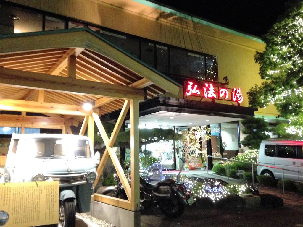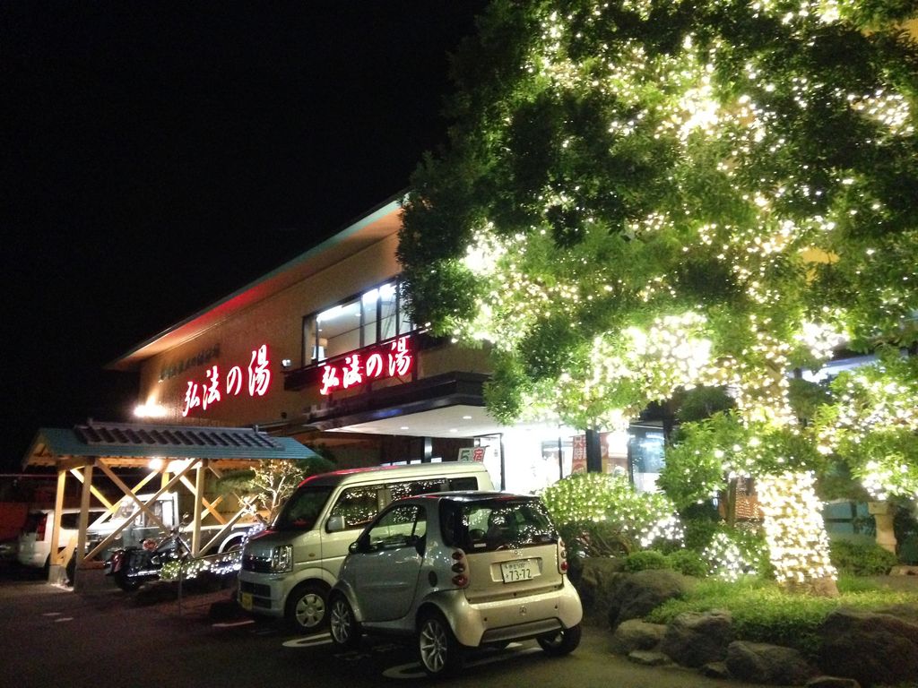 伊豆長岡の温泉街でひときわ目を惹くド派手な施設。それが弘法の湯だ。古奈と長岡に2店舗を構えるが、派手なのは長岡店。豪華なイルミネーションで飾り、毎日がクリスマスのよう。それでいて公式サイトでは「閑静な佇まいでくつろぎのひととき」と言っているのだから、いったい何処が?と突っ込みを入れたくなる。旅館と呼ぶにはカジュアルだし、日帰り入浴としての利用方法や雰囲気は健康ランドにも似ている。
