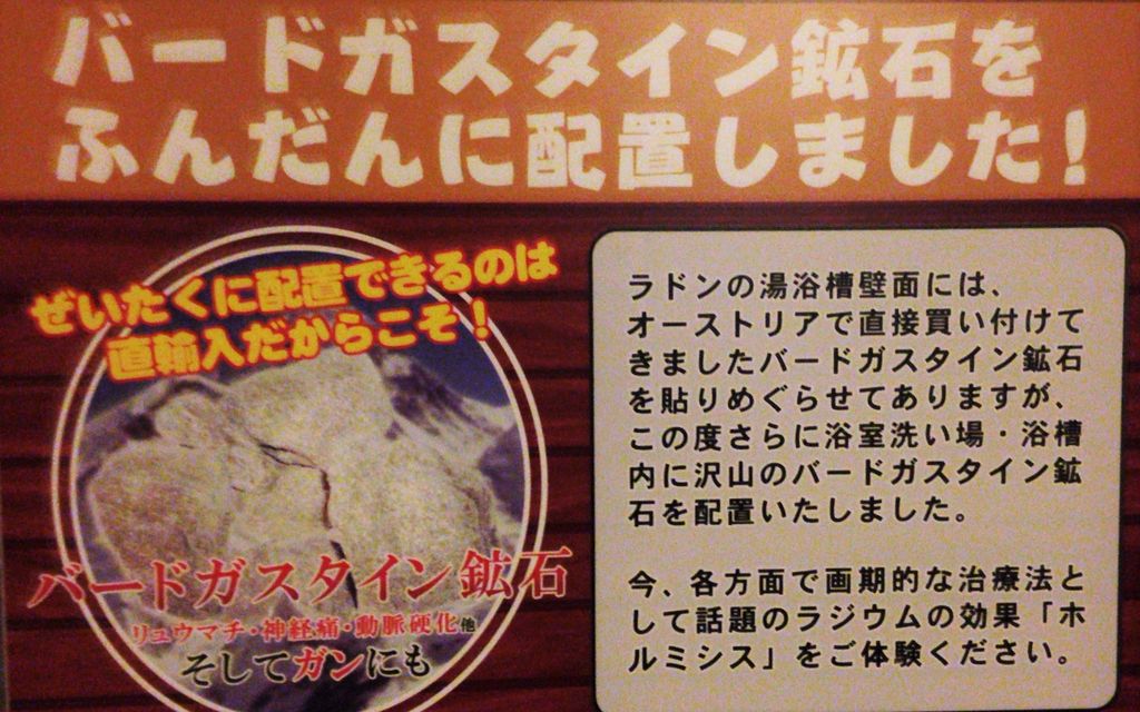 浴室内ではミストサウナがかなりの広さを占めており、岩盤浴室に似た感じで1人分にブースが仕切られている。ミストサウナというだけあって大量の霧があちこちから降り注ぐ。岩盤浴とミストサウナの違いは霧の量と、根本的に浴衣か裸か。どちらも床には御影石を、壁にはバード・ガスタイン鉱石を使用し、降り注ぐ霧は北投石を通した温泉水。そしてラドン温泉。湯口の真下には箱詰めされた北投石があって、そのラジウム効果を謳ったもの。よくあるラドン温泉は部屋として囲っているが、ここは浴室の壁にバード・ガスタイン鉱石を使用しているため、全体がラドン室という考え。換気扇を回していないため、多少もわっとし、岩盤浴とミストサウナのあとだからぐったりする。露天風呂からは石積みの崖を眺める。外気に触れるありがたみを実感した。