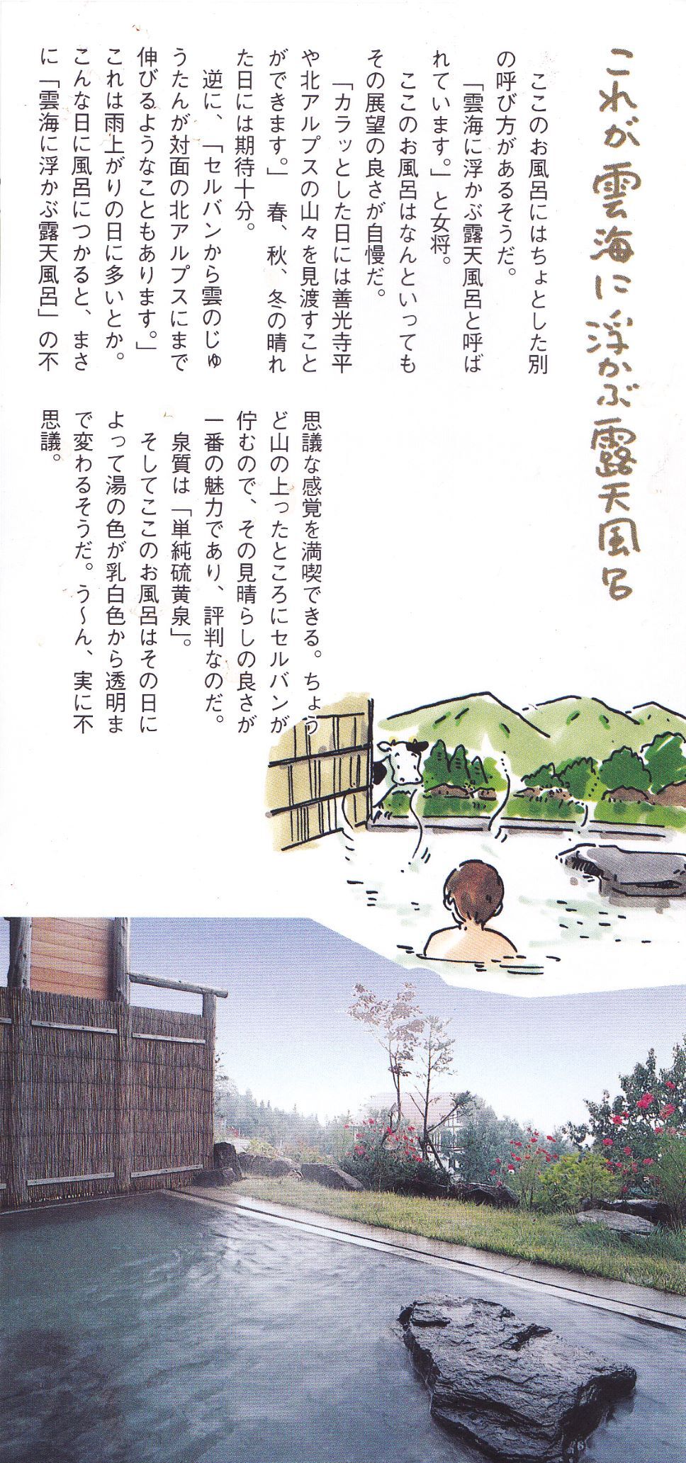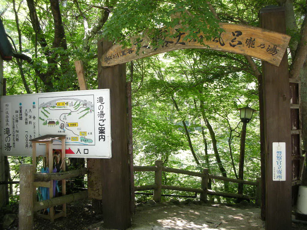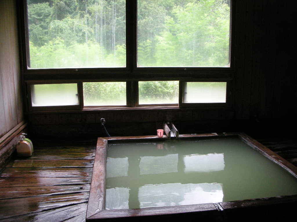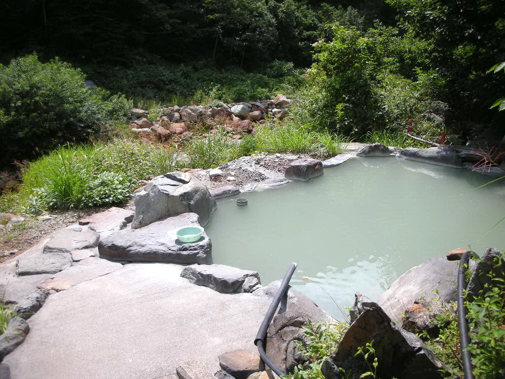露天風呂も巨大な岩を配してつくった岩風呂。松川の河原も巨岩がゴロゴロしているが、こんなに大きな岩を運ぶのは大変だったはず。「岩を配して」というより、天然の岩場を一部くりぬいているのだろうか。これでもかと言わんばかりのダイナミックさである。露天風呂は混浴で、女性はバスタオルの着用が義務となっている。女湯の出入口の奥には女性専用スペースがあるのだが、目隠しになるようなものは何もない。むしろそのさらに奥からは松川の河原を眺めることができ、女性が誰もいなかったので、みんな自由に行き来していた。松川を取り巻く緑が間近に迫り、野趣あふれるロケーション。お湯は透明度があるのだが、1cmほどの糸状になった湯の花がたくさん舞っている。そして季節柄、虫がたくさん浮いていた。