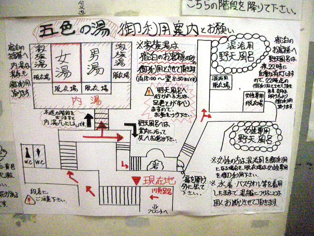 どう活用しているのかわからないが立派な水車小屋、受付兼有料休憩室、浴室の3棟からなり、これらの建物に囲まれた空間にはテーブルとベンチが置いてある。こうした配置や雰囲気も白骨と似ている。あとで知ったが、駐車場脇にあった建物(1枚目の写真)は宿泊棟であるようだ。料金は下記の通り。