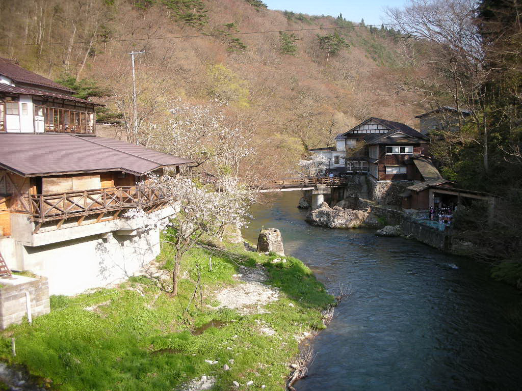 まずは自炊部玄関よりいちばん近いところにある、山水閣の地階にある「豊沢の湯」へ。豊沢川に面して大きな湯船が1つあり、ホテルの大浴場っぽい雰囲気。しかしながら大きな岩を組み合わせた湯船で、半露天のつくりであったが、夏場以外はガラス戸を設けて内風呂へと様変わりするようだ。川面まで2〜3mの高さにあり、対岸は雑木林となっている。まだ新緑の時期には早く、枯れ木ばかりであったが。大沢温泉の風呂の中で、最も万人受けするのが豊沢の湯だろう。
