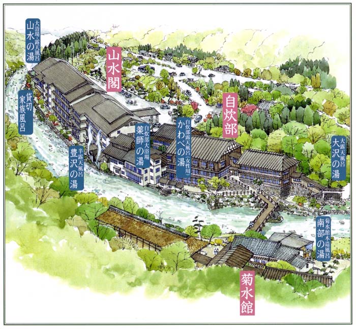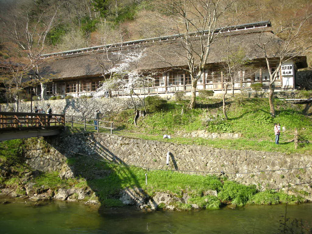 大沢温泉の歴史は古く、延暦年間(約1200年前)に坂上田村麻呂が傷を癒したという伝説が残る。また、慶応3年(1867)には南部藩主40代利剛公が湯治に訪れ、ほかにも宮沢賢治や高村光太郎が訪れている。豊沢川に架かる曲がり橋より周囲を見渡すと、茅葺きの菊水館といい、田舎風情の自炊部といい、昔にタイムスリップしたかのような風景である。ホームページには大正末期の写真が載っているのだが、当時と何も変わっていないのだ。