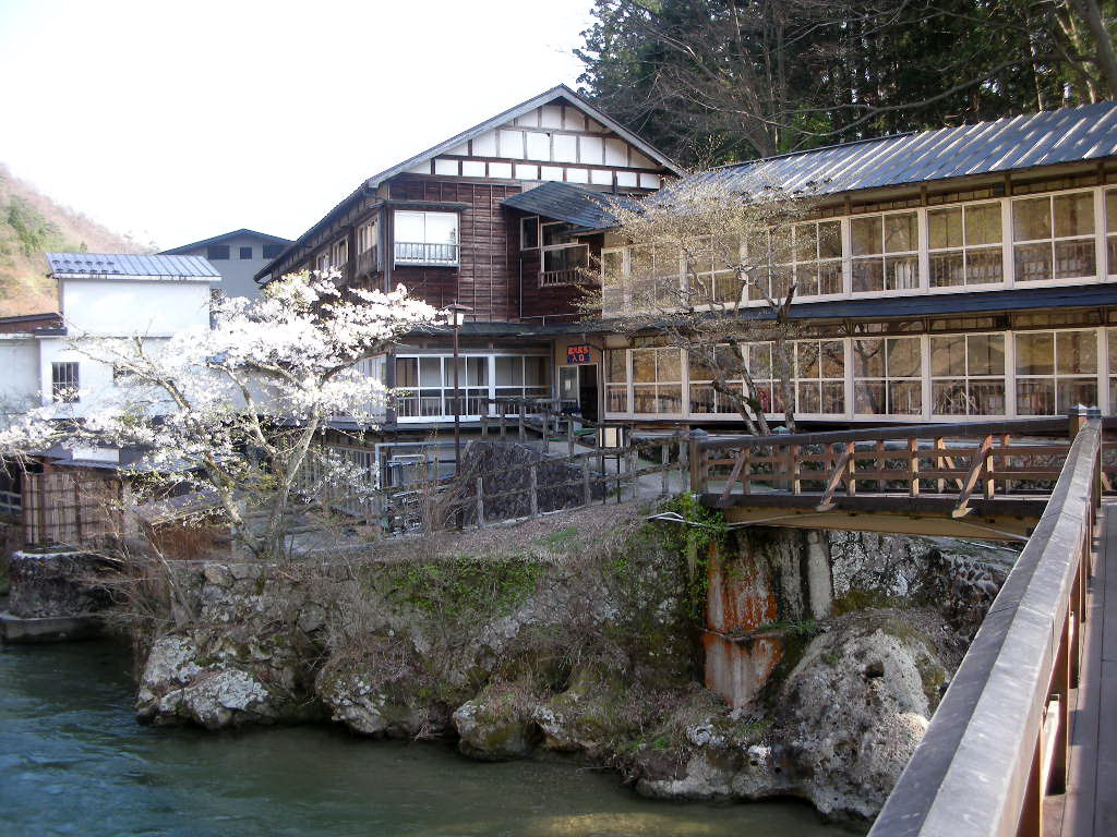 以上4ヶ所の風呂に入浴したが、自炊部には女性専用の露天風呂「かわべの湯」もある。温泉はすべて無色透明で、わずかにぬめり気があるが、肌ざわりはつるつる。ごく一部で循環処理を行っている。建物の雰囲気もそれぞれ個性的だったが、風呂もそれぞれが個性的だった。土手には山桜が咲き、春の息吹を感じさせてくれたが、新緑や紅葉の時期には、贅沢な景色を堪能できるのではないだろうか。