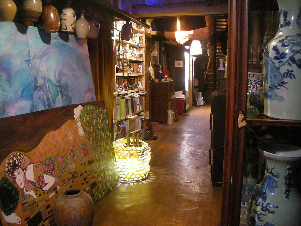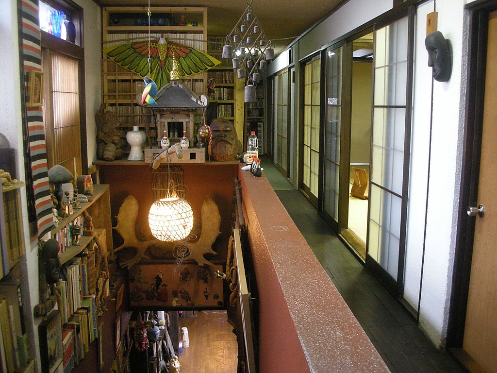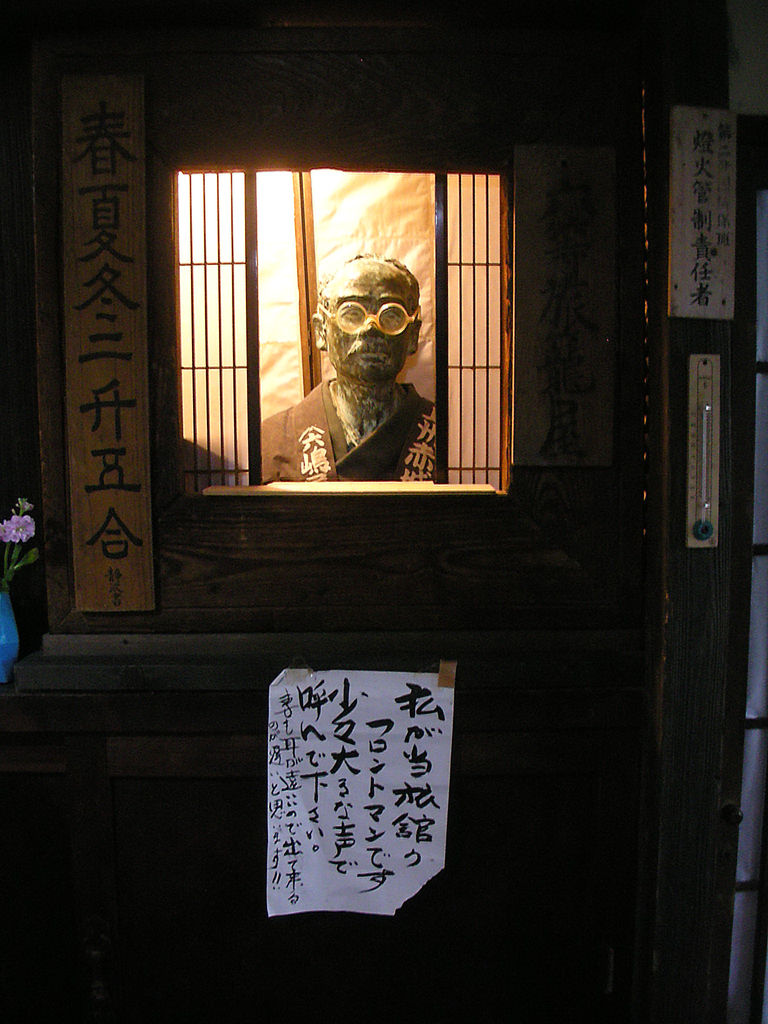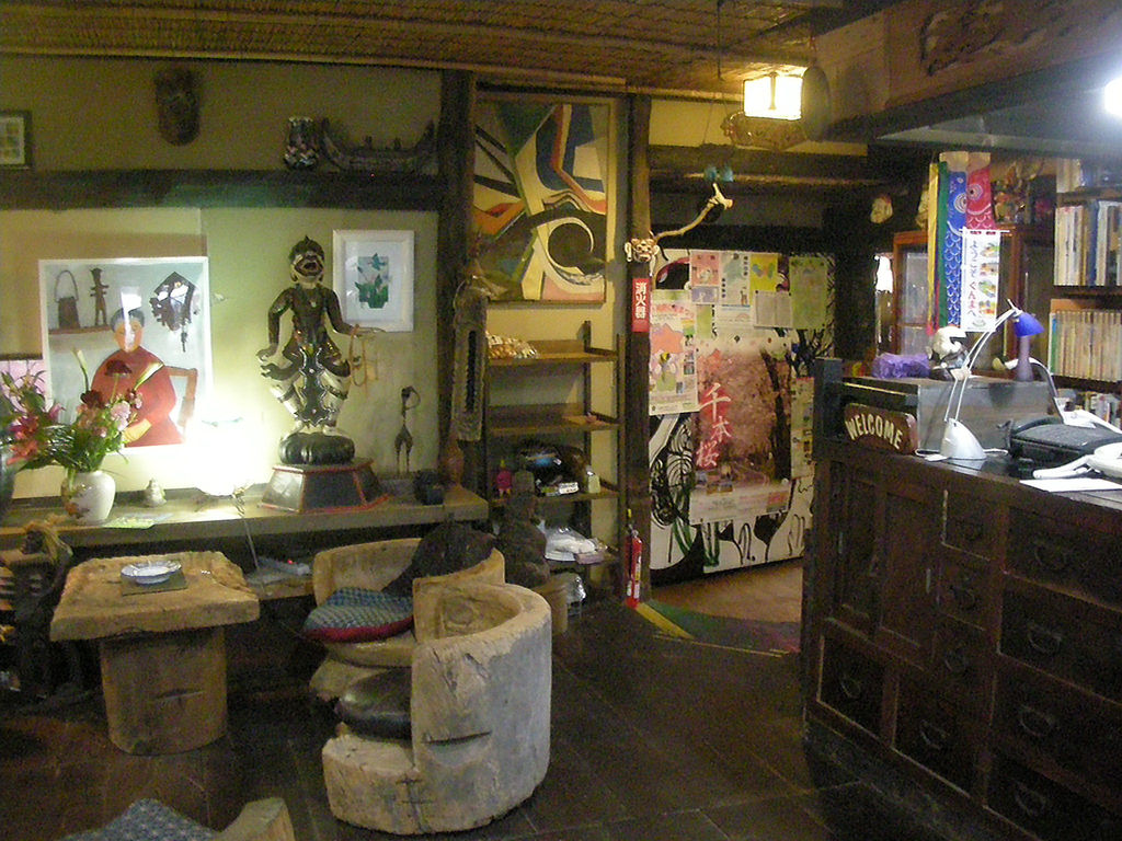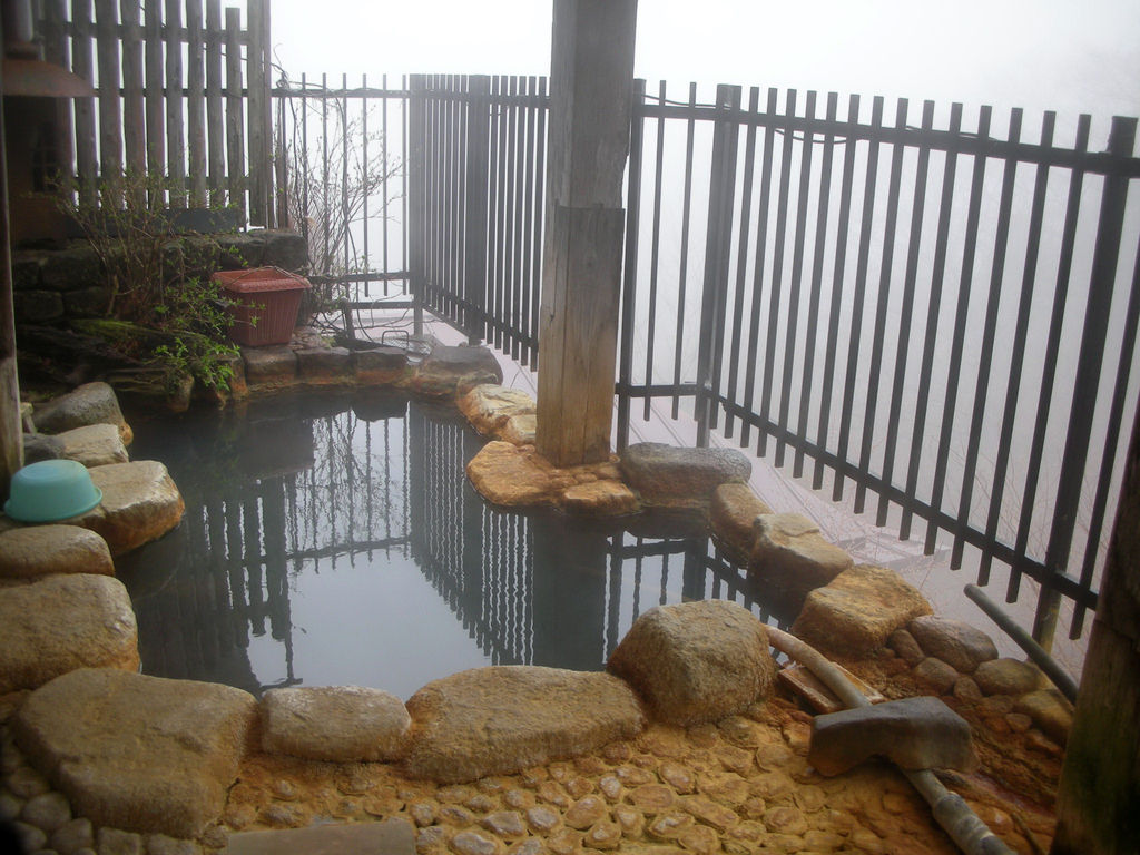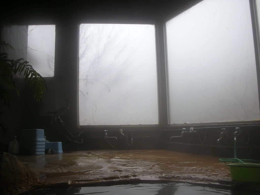 古民家の昔風情は座敷にも表れている。太平洋戦争に出征した先祖様のご尊顔や、赤紙(召集令状)などが飾られ、傍らの座卓は雑誌が雑然としていたり、まるで個人のお宅を訪ねているかのよう。客室は別棟にあるようだから雰囲気はわからぬが、母屋だけは素朴な民宿の趣。山里の斜面に建っているため、階段を下って浴室へ。ロッカーはないから籠を使う。